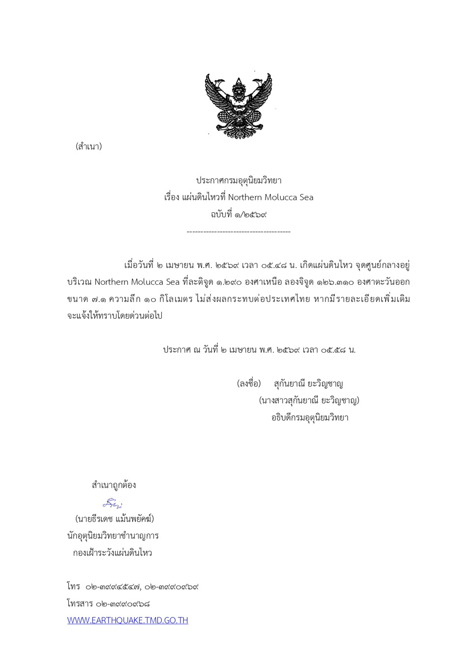วันที่ 2 เม.ย.69 กองเฝ้าระวังแผ่นดินไหว กรมอุตุนิยมวิทยา รายงานว่า เมื่อเวลา 05.48 น. เกิดแผ่นดินไหว ขนาด 7.1 ลึก 10 กม. จุดศูนย์กลางอยู่ที่บริเวณ ทะเลโมลุกกะเหนือ ที่ละติจุด 1.290 องศาเหนือ ลองจิจุด 126.310 องศาตะวันออกไม่มีผลกระทบต่อไทย