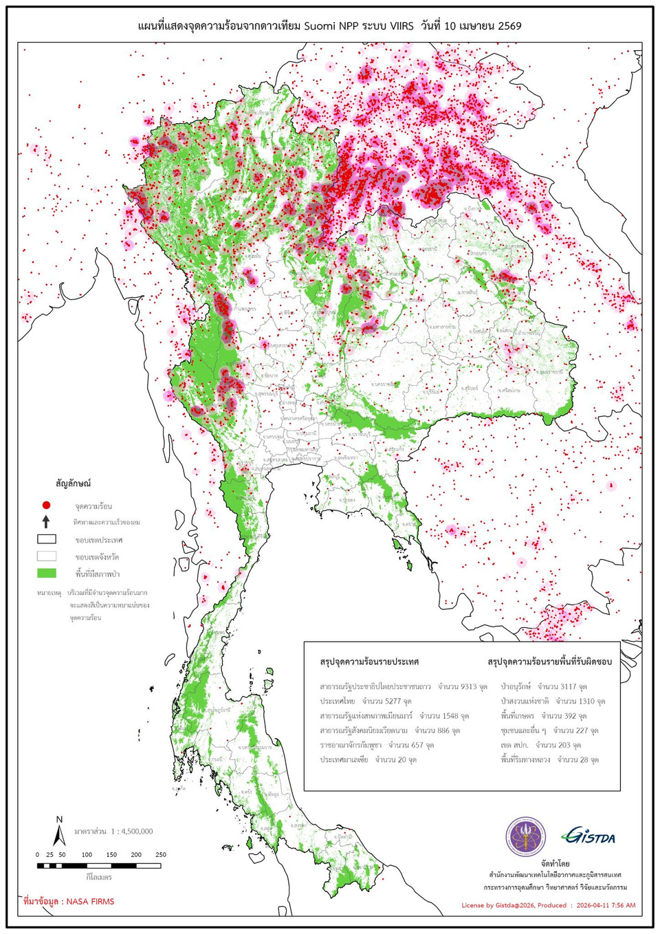 วันที่ 11 เม.ย.69 สำนักงานพัฒนาเทคโนโลยีอวกาศและภูมิสารสนเทศ (องค์การมหาชน) หรือ GISTDA รายงานจุดความร้อนด้วยข้อมูลจากดาวเทียม วานนี้ (10 เมษายน 69) จุดความร้อนของไทยพบ 5,277 จุด