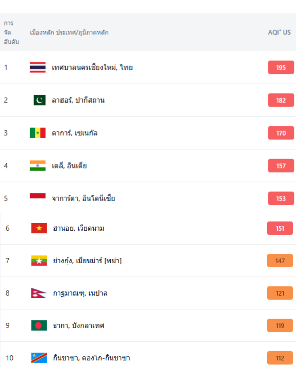 จากข้อมูลการจัดอันดับสดเมืองใหญ่ที่มีมลพิษมากที่สุดในโลกโดย IQAir ในช่วงเช้าวันที่ 13 เมษายน 2569 (06.00-07.00 น.) เทศบาลนครเชียงใหม่ ประเทศไทย ได้รับการจัดอันดับให้เป็นเมืองที่มีมลพิษทางอากาศสูงสุดเป็นอันดับ 1 ของโลก ด้วยค่า AQI ที่พุ่งสูงถึง 195 ซึ่งจัดอยู่ในโซนสีแดง หมายถึงคุณภาพอากาศที่ไม่ดีต่อสุขภาพอย่างมาก โดยเฉพาะกลุ่มคนที่มีความอ่อนไหวและผู้ป่วยโรคระบบทางเดินหายใจ โดยอันดับรองลงมาได้แก่ ลาฮอร์ ปากีสถาน (182), ดาการ์ เซเนกัล (170), เดลี อินเดีย (157), จาการ์ตา อินโดนีเซีย (153), ฮานอย เวียดนาม (151), ย่างกุ้ง เมียนมาร์ (147), กาฐมาณฑุ เนปาล (121), ธากา บังกลาเทศ (119) และกินชาซา คองโก-กินชาซา (112) ซึ่งแสดงให้เห็นว่าปัญหาฝุ่น PM2.5 ยังคงเป็นวิกฤตการณ์ระดับภูมิภาคและระดับโลกที่ต้องเร่งแก้ไข