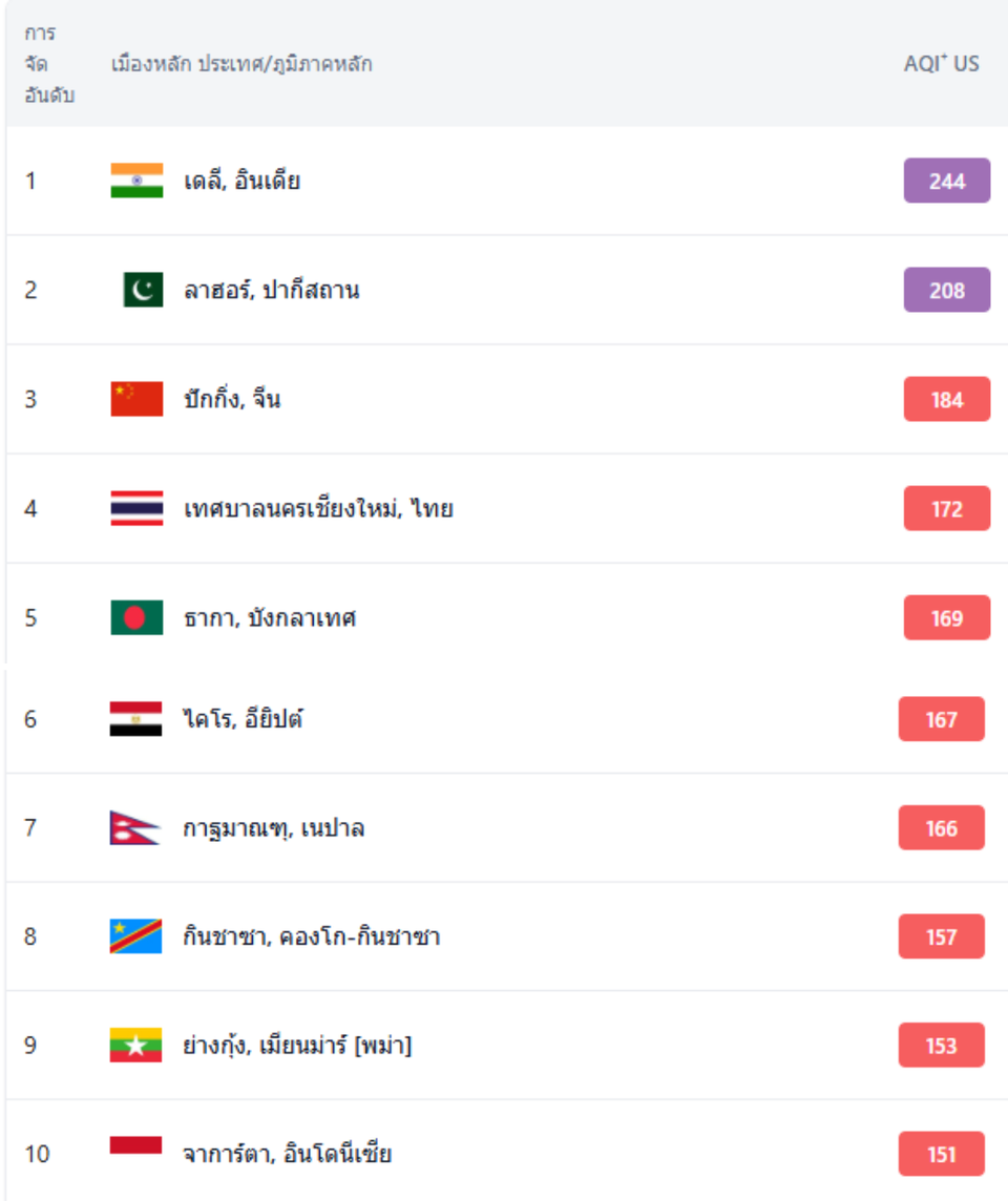 การจัดอันดับ 10 เมืองมลพิษโลกในครั้งนี้สะท้อนให้เห็นถึงปัญหาใหญ่ที่หลายประเทศกำลังเผชิญ โดยเฉพาะในภูมิภาคเอเชียใต้และเอเชียตะวันออกเฉียงใต้ อันดับ 1 คือ เดลี อินเดีย ด้วย AQI 244 ตามมาด้วย ลาฮอร์ ปากีสถาน (AQI 208) และปักกิ่ง จีน (AQI 184) แสดงให้เห็นถึงความท้าทายในการจัดการปัญหามลพิษทางอากาศในเมืองใหญ่ที่มีประชากรหนาแน่นและมีการพัฒนาอุตสาหกรรมอย่างรวดเร็ว นอกจากนี้ยังมีธากา บังกลาเทศ (AQI 169), ไคโร อียิปต์ (AQI 167), กาฐมาณฑุ เนปาล (AQI 166), กินชาซา คองโก-กินชาซา (AQI 157), ย่างกุ้ง เมียนมาร์ (AQI 153) และจาการ์ตา อินโดนีเซีย (AQI 151) ที่ล้วนแต่เผชิญปัญหาใกล้เคียงกัน