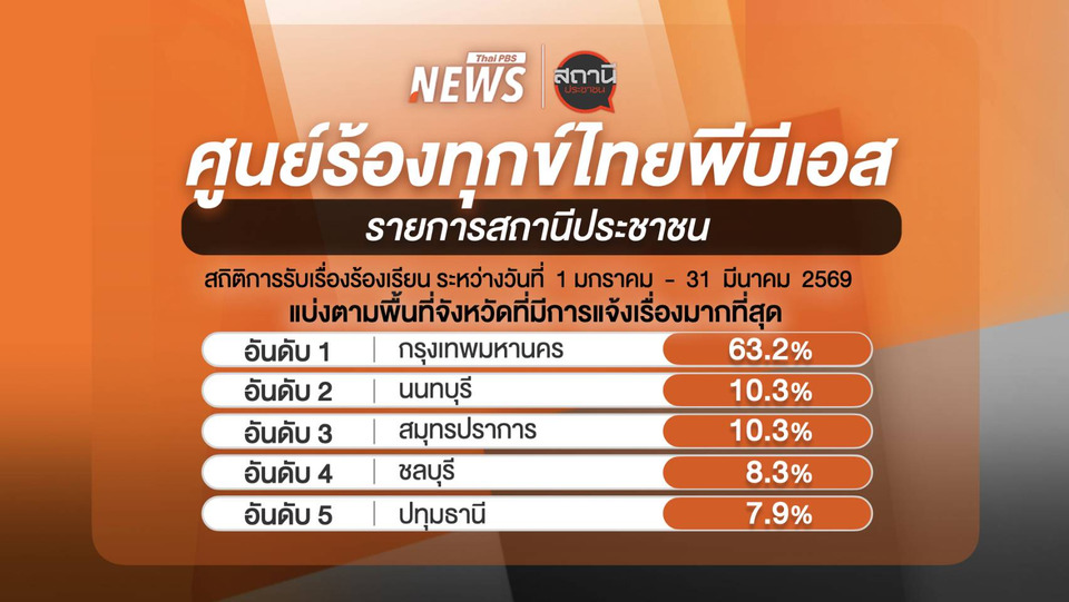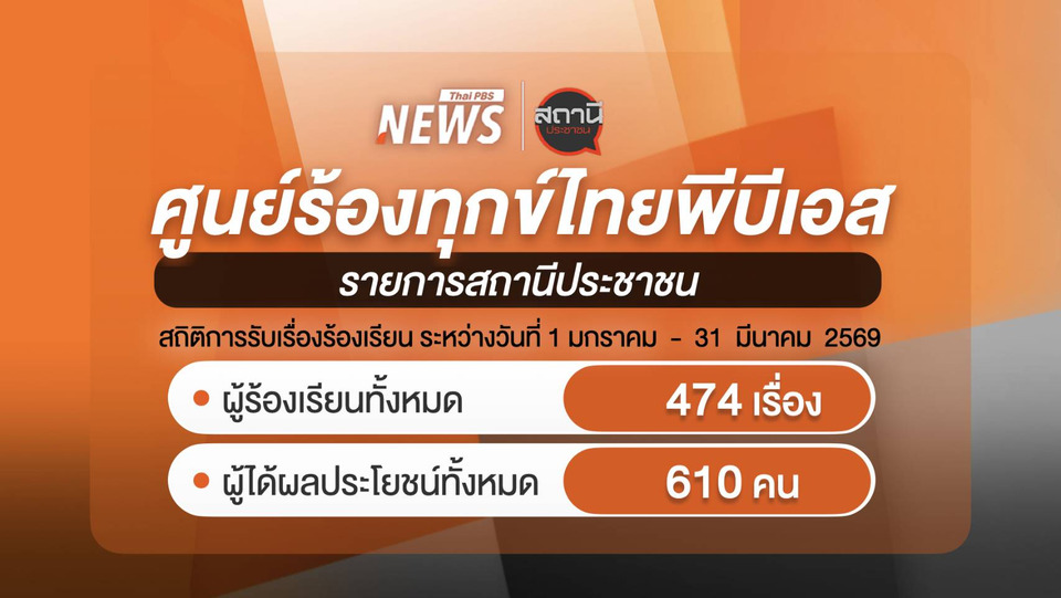 ข้อมูลจากศูนย์ร้องทุกข์ไทยพีบีเอส รายการ “สถานีประชาชน” ช่วงวันที่ 1 มกราคม –31 มีนาคม 2569 ได้รับเรื่องร้องเรียนจากประชาชนรวม 474 เรื่อง และสามารถช่วยเหลือจนมีผู้ได้รับผลประโยชน์ถึง 610 คน ครอบคลุมปัญหาหลากหลายด้าน โดยปัญหาที่ได้รับร้องเรียนมากที่สุด 5 อันดับแรก อันดับ 1 แจ้งคนหาย อันดับ 2 ปรึกษากฎหมาย อันดับ 3 ปัญหาผู้บริโภคอันดับ 4 ปัญหาสิ่งแวดล้อม อันดับ 5 การต้มตุ๋น หลอกลวง ฉ้อโกง นอกจากนั้นเป็นปัญหาโครงการของรัฐ ประสานช่วยเหลือผู้ด้อยโอกาส ภัยออนไลน์ ปัญหาสาธารณูปโภค ภัยพิบัติ หนี้นอกระบบ เป็นต้น สะท้อนให้เห็นว่ารายการยังคงเป็นพื้นที่กลางที่ประชาชนใช้พึ่งพาและส่งเสียงถึงสังคมได้อย่างต่อเนื่อง