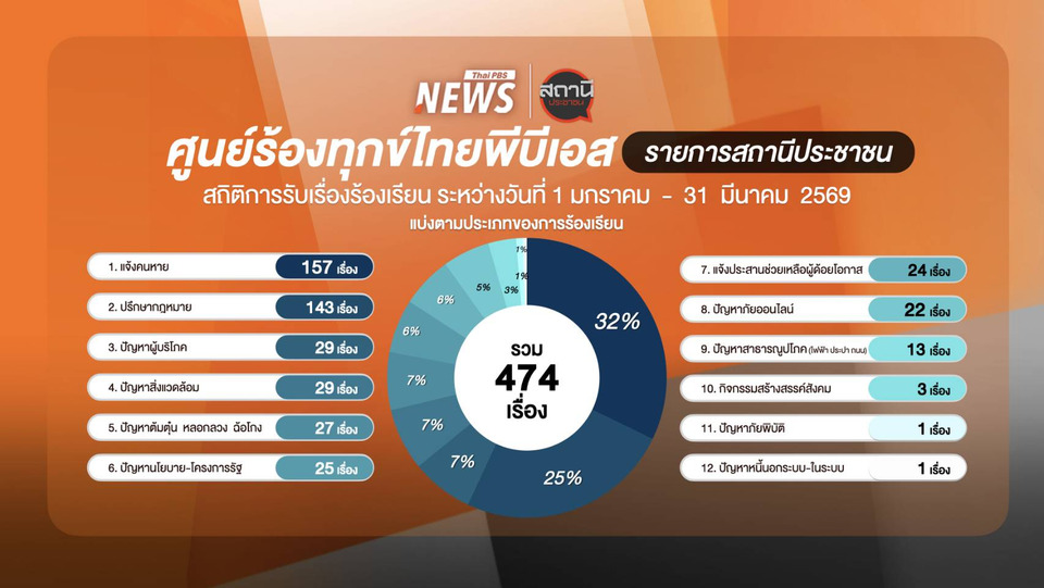 รายการ “สถานีประชาชน” เผยสถิติ 3 เดือนแรกปี 2569 ร้องเรียนรวม 474 เรื่อง “คนหาย–ปรึกษากฎหมาย-ผู้บริโภค-สิ่งแวดล้อม-ฉ้อโกง” 5 ประเด็นสูงสุด ช่วยหาคนหายติดตามจนแจ้งพบแล้ว 86 เคส ขณะที่ตลอดปี 2568 มีผู้ได้รับการช่วยเหลือ 43,774 ราย ตอกย้ำบทบาทสื่อสาธารณะ ช่วยคลี่คลายปัญหา หาทางออกให้ประชาชน