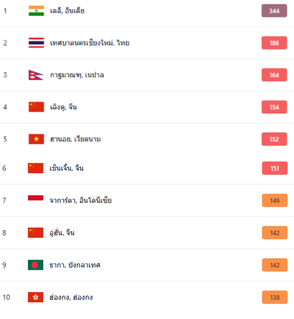 จากการจัดอันดับในวันเดียวกัน เมื่อช่วงเวลา 06.00-07.00 น.ของววันที่ 19 เม.ย.69 พบว่า 10 อันดับแรกของเมืองที่มีมลพิษมากที่สุดในโลกส่วนใหญ่เป็นเมืองในทวีปเอเชีย ซึ่งเป็นภูมิภาคที่กำลังเผชิญกับความท้าทายด้านสิ่งแวดล้อมอย่างหนักหน่วง โดยมีรายละเอียดดังนี้: