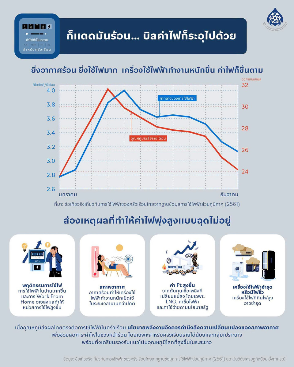 สำนักงานคณะกรรมการสิทธิมนุษยชนแห่งชาติเปิดเผยข้อมูลเพื่อไขข้อสงสัยถึงสาเหตุที่ค่าไฟฟ้ามักพุ่งสูงขึ้นตามสภาพอากาศในช่วงฤดูร้อน โดยยืนยันว่าอุณหภูมิมีความสัมพันธ์โดยตรงกับการใช้ไฟฟ้าในครัวเรือน ซึ่งอ้างอิงจากงานวิจัย "ข้อเท็จจริงเกี่ยวกับการใช้ไฟฟ้าของครัวเรือนไทย จากฐานข้อมูลการใช้ไฟฟ้าส่วนภูมิภาค (2561)" ที่วิเคราะห์รูปแบบข้อมูลการใช้ไฟฟ้าของการไฟฟ้าส่วนภูมิภาค (กฟภ.) และสถิติกรมอุตุนิยมวิทยาในช่วงปี 2556-2559