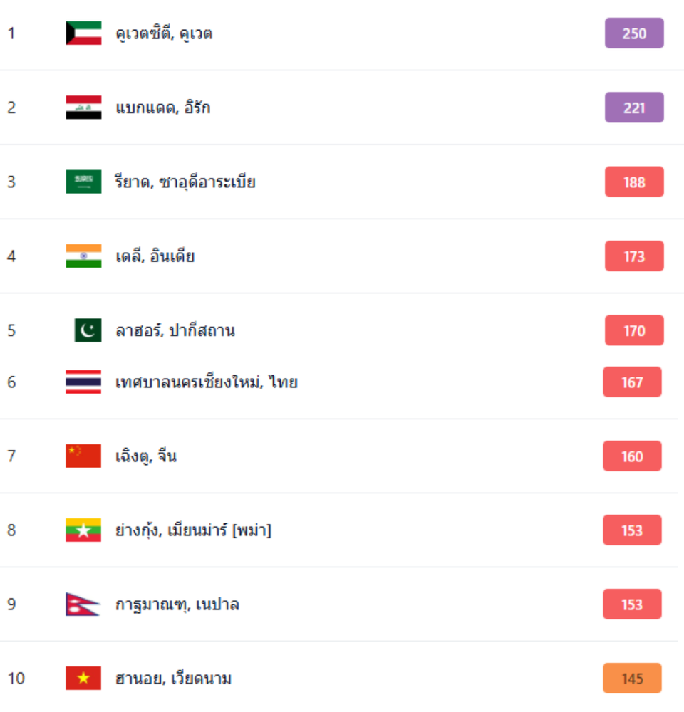 จากการรวบรวมข้อมูลคุณภาพอากาศแบบเรียลไทม์ในเช้าวันที่ 20 เมษายน 2569 พบว่าเมืองใหญ่ในภูมิภาคตะวันออกกลางและเอเชียใต้ยังคงเผชิญกับสถานการณ์มลพิษทางอากาศที่เลวร้ายที่สุด โดย 3 อันดับแรกได้แก่ คูเวตซิตี (คูเวต) ด้วยค่า AQI 250, แบกแดด (อิรัก) AQI 221 และรียาด (ซาอุดีอาระเบีย) AQI 188 สถานการณ์นี้สะท้อนถึงปัจจัยหลายอย่าง ไม่ว่าจะเป็นสภาพภูมิประเทศที่ปิดล้อม การจราจรที่หนาแน่น หรือแม้แต่พายุฝุ่นที่เกิดขึ้นบ่อยครั้งในภูมิภาคดังกล่าว ซึ่งล้วนเป็นตัวเร่งให้ค่ามลพิษพุ่งสูงขึ้นอย่างน่าเป็นห่วง