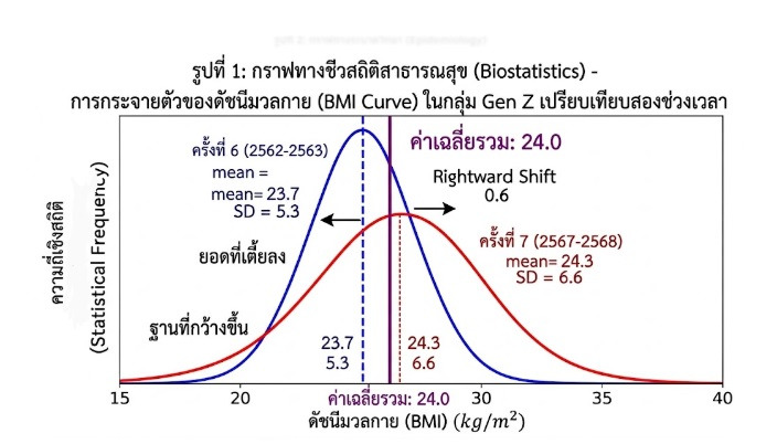 ในมิติของชีวสถิติ ค่าเฉลี่ยดัชนีมวลกาย (Mean BMI) ของกลุ่มตัวอย่างเพิ่มขึ้นจาก 23.7 kg/m² เป็น 24.3 kg/m² ภายในระยะเวลาเพียง 5 ปี การขยับขึ้นของค่ากลางเพียง 0.6 หน่วยในระดับประชากร หมายถึงการเคลื่อนย้ายของประชากรจำนวนมหาศาลจากกลุ่มสุขภาพดีเข้าสู่ กลุ่มเสี่ยง และที่สะท้อนความเหลื่อมล้ำทางสุขภาพได้ชัดเจนที่สุดคือ ค่าเบี่ยงเบนมาตรฐาน (SD) ที่เพิ่มขึ้นจาก 5.3 เป็น 6.6 ซึ่งบ่งชี้ว่ากลุ่มที่มีน้ำหนักเกินเกณฑ์มาตรฐานอยู่เดิมมีภาวะอ้วนที่รุนแรงยิ่งขึ้นอย่างก้าวกระโดด