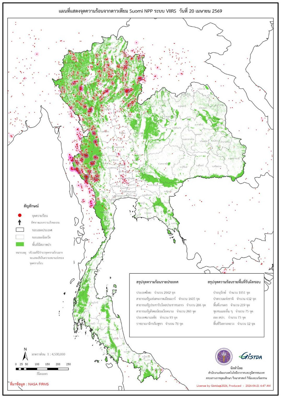 วันที่ 21 เม.ย.69 สำนักงานพัฒนาเทคโนโลยีอวกาศและภูมิสารสนเทศ (องค์การมหาชน) หรือ GISTDA รายงานจุดความร้อนด้วยข้อมูลจากดาวเทียม วานนี้ (20 เมษายน 69) จุดความร้อนของไทยพบ 2,862 จุด