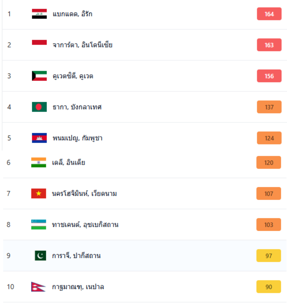 เมื่อเช้าตรู่วันที่ 29 เมษายน 2569 ระหว่างเวลา 06.00-07.00 น. ตามเวลาประเทศไทย แบกแดด เมืองหลวงของอิรัก ได้รับการจัดอันดับให้เป็นเมืองที่มีคุณภาพอากาศแย่ที่สุดในโลก ด้วยดัชนีคุณภาพอากาศ (AQI) สูงถึง 164 ตามมาด้วยจาการ์ตา อินโดนีเซีย และคูเวตซิตี คูเวต ซึ่งสะท้อนวิกฤตมลพิษทางอากาศที่ทวีความรุนแรงขึ้นทั่วโลก โดยเฉพาะในภูมิภาคเอเชียและตะวันออกกลาง ซึ่งประเทศไทยเองก็ไม่อาจมองข้ามผลกระทบที่อาจเกิดขึ้นได้ในอนาคตอันใกล้