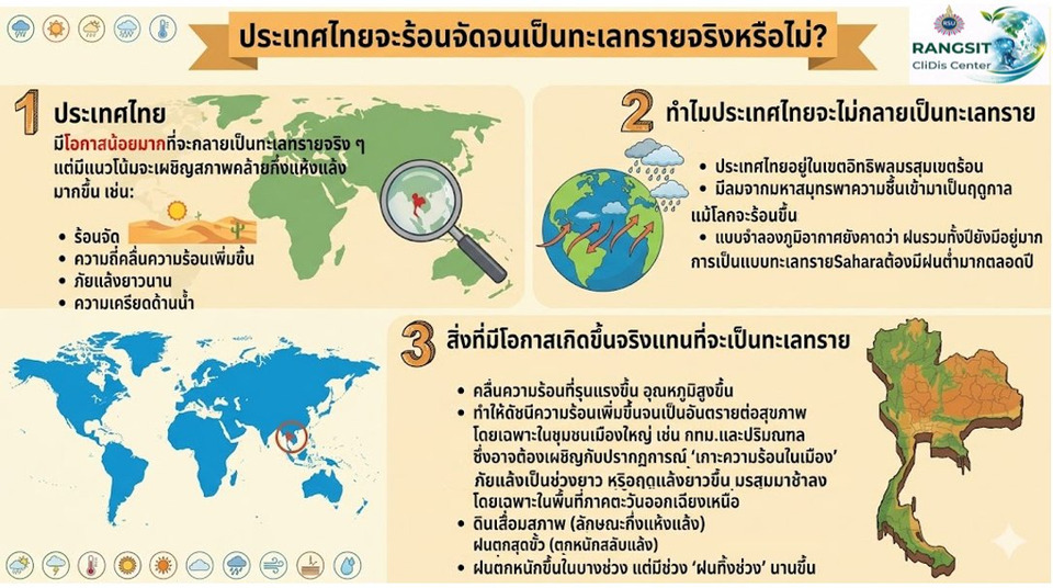 ศูนย์ภูมิอากาศ และภัยพิบัติ ม.รังสิต ได้รับการสอบถามจากภาคประชาชนหลายภาคส่วนว่า ประเทศไทยมีโอกาสที่จะเผชิญกับสภาพอากาศแห้งแล้งแบบในทะเลทรายหรือไม่ ?