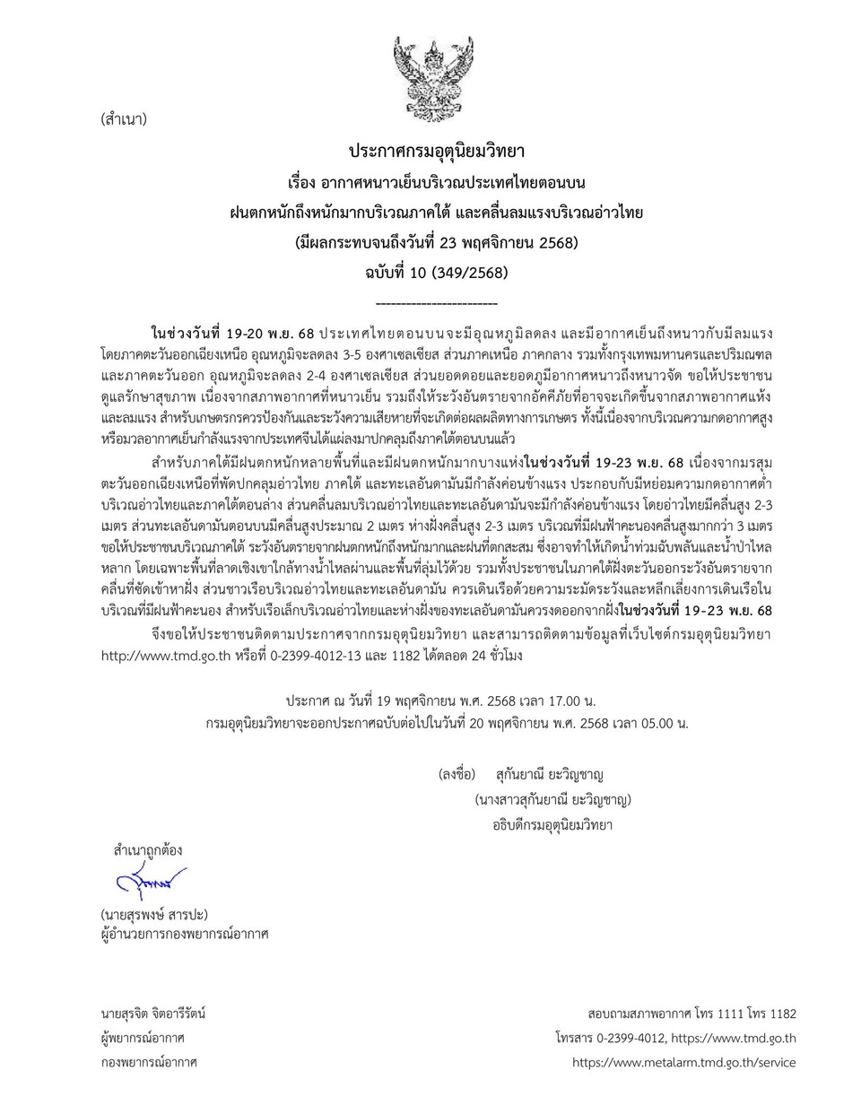 ประกาศ ณ วันที่ 19 พฤศจิกายน พ.ศ. 2568 เวลา 17.00 น. กรมอุตุนิยมวิทยา จะออกประกาศฉบับต่อไปในวันที่ 20 พฤศจิกายน พ.ศ. 2568 เวลา 05.00 น.