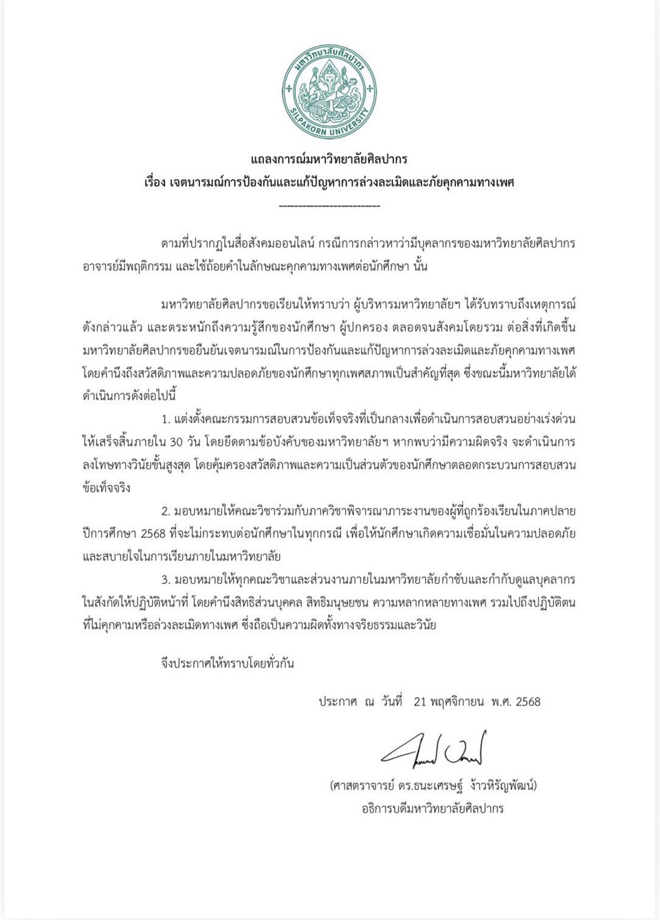 ด้าน ดร.ธนะเศรษฐ์ จ้าวหิรัญพัฒน์ อธิการบดีมหาวิทยาลัยศิลปากร และผู้บริหารมหาวิทยาลัยฯ ได้รับทราบถึงเหตุการณ์ดังกล่าวและตระหนักถึงความรู้สึกของนักศึกษา ผู้ปกครอง ตลอดจนสังคมโดยรวมต่อสิ่งที่เกิดขึ้น มหาวิทยาลัยศิลปากรจึงขอยืนยันเจตนารมณ์ในการป้องกันและแก้ปัญหาการล่วงละเมิดและภัยคุกคามทางเพศ โดยคํานึงถึงสวัสดิภาพและความปลอดภัยของนักศึกษาทุกเพศสภาพเป็นสําคัญ