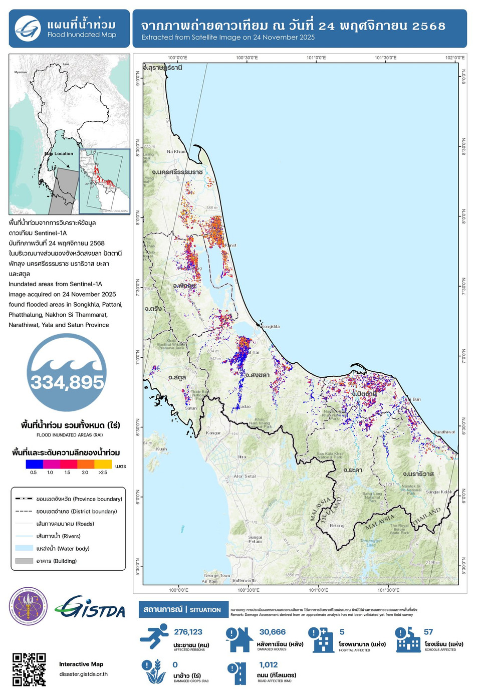 วันที่ 24 พ.ย.68 สำนักงานพัฒนาเทคโนโลยีอวกาศและภูมิสารสนเทศ (องค์การมหาชน) หรือ GISTDA รายงานสถานการณ์ล่าสุด ด้วยข้อมูลภาพถ่ายจากดาวเทียม Radarsat-2 เพื่อสนับสนุนการบริหารจัดการน้ำท่วมในพื้นที่ภาคใต้ของไทย โดยข้อมูลจากดาวเทียมพบพื้นที่ที่มีน้ำท่วมขังรวมประมาณ 334,895 ไร่ ในพื้นที่บางส่วนของ 7 จังหวัด ได้แก่:
