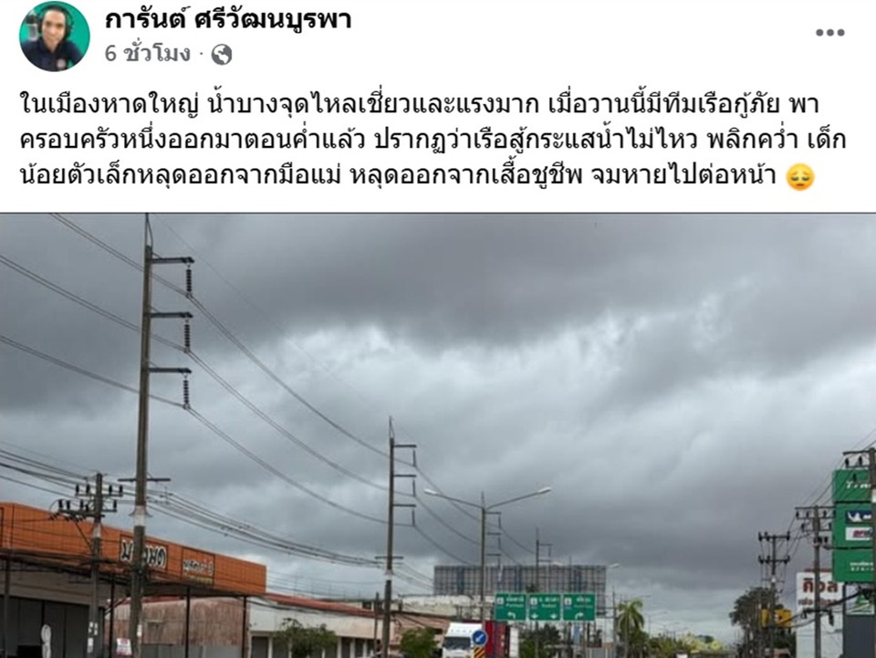 วันที่ 26 พ.ย.68 เฟซบุ๊ก การันต์ ศรีวัฒนบูรพา ผู้ช่วยโฆษกสถาบันการแพทย์ฉุกเฉินแห่งชาติ โพสต์ภาพน้ำท่วมพร้อมข้อความระบุว่า ในเมืองหาดใหญ่ น้ำบางจุดไหลเชี่ยวและแรงมาก เมื่อวานนี้มีทีมเรือกู้ภัย พาครอบครัวหนึ่งออกมาตอนค่ำแล้ว ปรากฏว่าเรือสู้กระแสน้ำไม่ไหว พลิกคว่ำ เด็กน้อยตัวเล็กหลุดออกจากมือแม่ หลุดออกจากเสื้อชูชีพ จมหายไปต่อหน้า