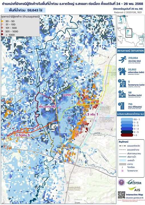 ข้อมูลภาพถ่ายจากดาวเทียม StriX-4 ของวันที่ 25 พฤศจิกายน 2568 เวลา 07.20 น. เมื่อนำมาวิเคราะห์พื้นที่น้ำท่วมโดย GISTDA ผลการแปลข้อมูลพบว่า พื้นที่น้ำท่วมรวม 59,643 ไร่ ครอบคลุมเขตเมืองหาดใหญ่และพื้นที่ใกล้เคียง โดยแผนที่แสดงความลึกของน้ำตั้งแต่ระดับ 0.5 เมตร จนถึงมากกว่า 5 เมตร พร้อมตำแหน่งจุดที่ยังมีการใช้งานมือถืออย่างต่อเนื่องในเขตน้ำท่วม