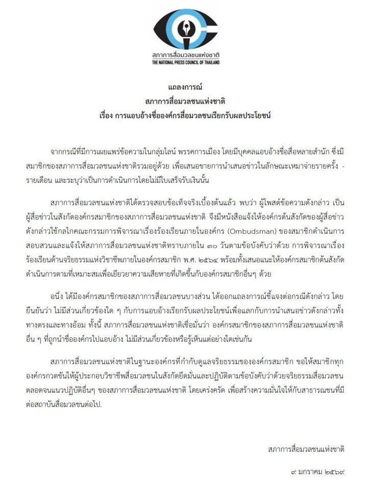 วันที่ 9 ม.ค.69สภาการสื่อมวลชนแห่งชาติ ออกแถลงการณ์ เรื่อง การแอบอ้างชื่อองค์กรสื่อมวลชนเรียกรับผลประโยชน์ ระบุว่า จากกรณีที่มีการเผยแพร่ข้อความในกลุ่มไลน์ พรรคการเมือง โดยมีบุคคลแอบอ้างชื่อสื่อหลายสำนัก ซึ่งมีสมาชิกของสภาการสื่อมวลชนแห่งชาติรวมอยู่ด้วย เพื่อเสนอขายการนำเสนอข่าวในลักษณะเหมาจ่ายรายครั้ง – รายเดือน และระบุว่าเป็นการดำเนินการโดยไม่มีใบเสร็จรับเงินนั้น