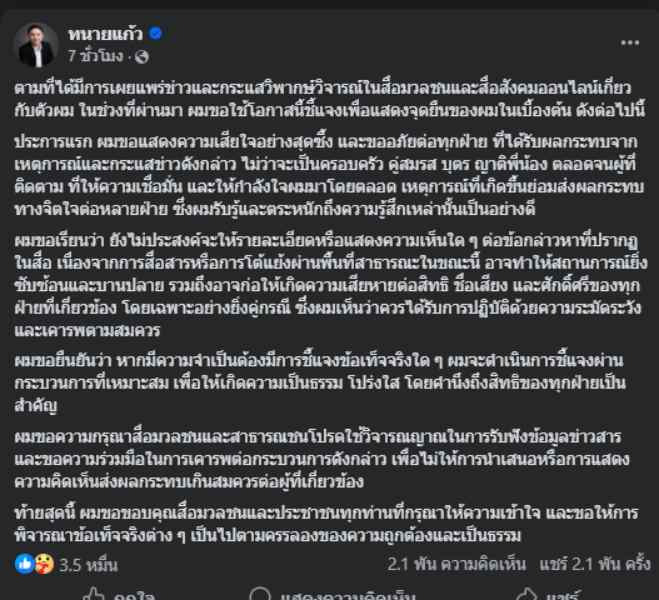 ผมขอเรียนว่า ยังไม่ประสงค์จะให้รายละเอียดหรือแสดงความเห็นใด ๆ ต่อข้อกล่าวหาที่ปรากฏในสื่อ เนื่องจากการสื่อสารหรือการโต้แย้งผ่านพื้นที่สาธารณะในขณะนี้ อาจทำให้สถานการณ์ยิ่งซับซ้อนและบานปลาย รวมถึงอาจก่อให้เกิดความเสียหายต่อสิทธิ ชื่อเสียง และศักดิ์ศรีของทุกฝ่ายที่เกี่ยวข้อง โดยเฉพาะอย่างยิ่งคู่กรณี ซึ่งผมเห็นว่าควรได้รับการปฏิบัติด้วยความระมัดระวังและเคารพตามสมควร