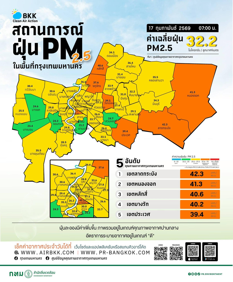 วันที่ 17 กุมภาพันธ์ 2569 เวลา 07:00 น.ศูนย์ข้อมูลคุณภาพอากาศกรุงเทพมหานคร ขอรายงานสถานการณ์ฝุ่นละอองขนาดไม่เกิน 2.5 ไมครอน (PM 2.5) ในกรุงเทพมหานคร