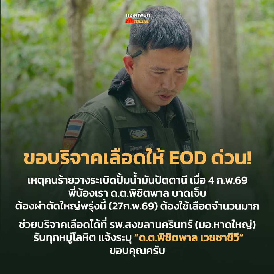 วันที่ 26 ก.พ.69 เพจ กองทัพบก ทันกระแส โพสต์ข้อความระบุว่า ขอบริจาคเลือดให้ EOD ด่วน! ... เหตุคนร้ายวางระเบิดปั้มน้ำมันปัตตานี เมื่อ 4 ก.พ.69 พี่น้องเรา ด.ต.พิชิตพาล บาดเจ็บ ต้องผ่าตัดใหญ่พรุ่งนี้ (27ก.พ.69) ต้องใช้เลือดจำนวนมาก ช่วยบริจาคเลือดได้ที่ณ รพ.สงขลานครินทร์ (มอ.หาดใหญ่) รับทุกหมู่โลหิต แจ้งระบุ “ด.ต.พิชิตพาล เวชชาชีวี” ขอบคุณครับ