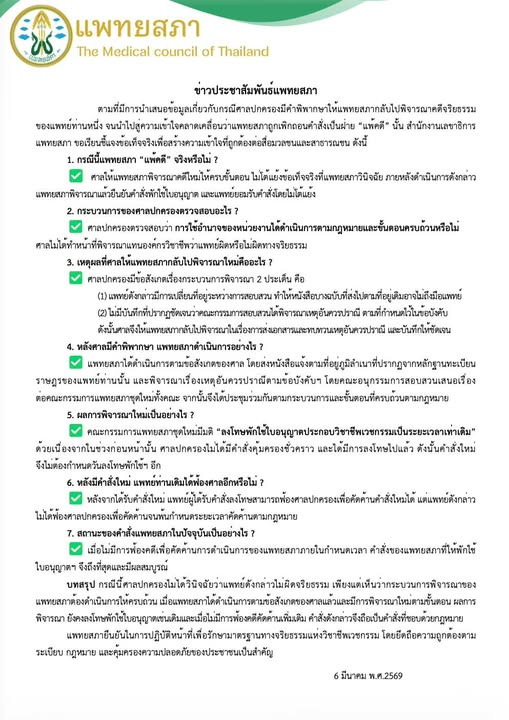 ล่าสุดวันที่ 6 มี.ค.69 แพทยสภา ได้เผยแพร่ข่าวประชาสัมพันธ์ ผ่านเพจเฟซบุ๊กโดยระบุว่า ตามที่มีการนำเสนอข้อมูลเกี่ยวกับกรณีศาลปกครองมีคำพิพากษาให้แพทยสภากลับไปพิจารณาคดีจริยธรรมของแพทย์ท่านหนึ่ง จนนำไปสู่ความเข้าใจคลาดเคลื่อนว่าแพทยสภาถูกเพิกถอนคำสั่งเป็นฝ่าย “แพ้คดี” นั้น สำนักงานเลขาธิการแพทยสภา ขอเรียนชี้แจงข้อเท็จจริงเพื่อสร้างความเข้าใจที่ถูกต้องต่อสื่อมวลชนและสาธารณชน ดังนี้