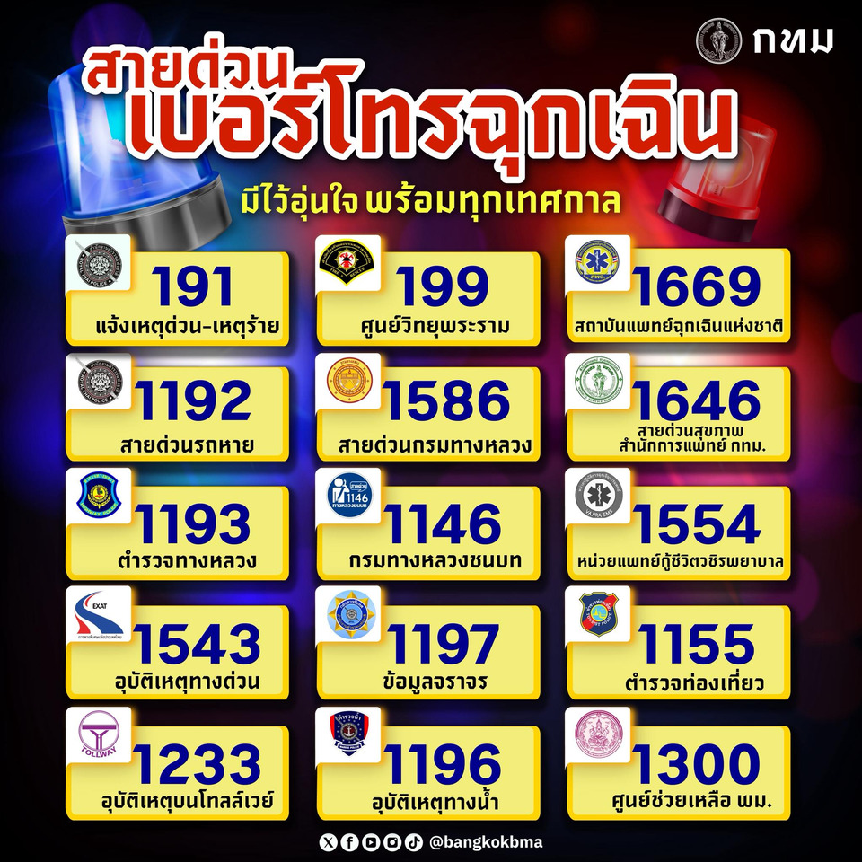 #สายด่วนฉุกเฉิน #เบอร์ฉุกเฉิน #กทม #กรุงเทพมหานคร #เหตุฉุกเฉิน #อุบัติเหตุ #แจ้งเหตุ191 #สายด่วน199 #รถหาย1192 #กู้ภัย #การแพทย์ฉุกเฉิน #เตือนภัย #ความปลอดภัย #ข่าววันนี้ #ข่าวด่วน #ข่าวสังคม #เซฟด่วน #เบอร์สำคัญ #EmergencyThailand #BangkokNews