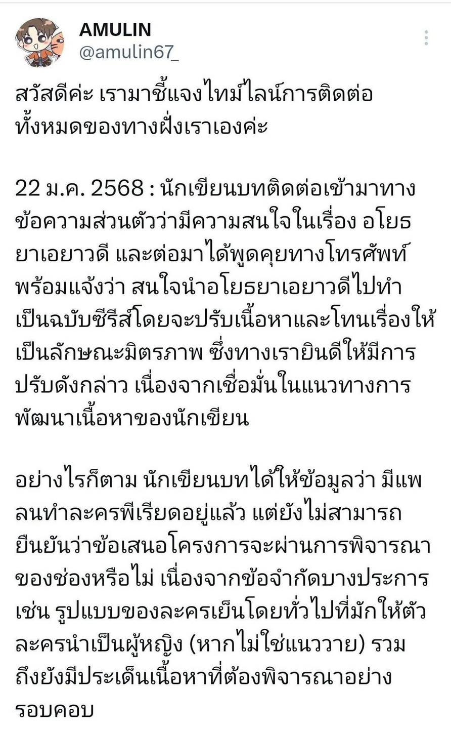 คุณ Amulin นักเขียนการ์ตูน อโยธยาเอยาวดี ออกมาเล่าถึงไทม์ไลน์ของการติดต่อกับบริษัทซีรี่ส์อย่างละเอียดครับ ซึ่งถ้าจริงตามนี้ก็บอกเลยว่า ได้แต่เฮ้อออออออออออออออออออออ