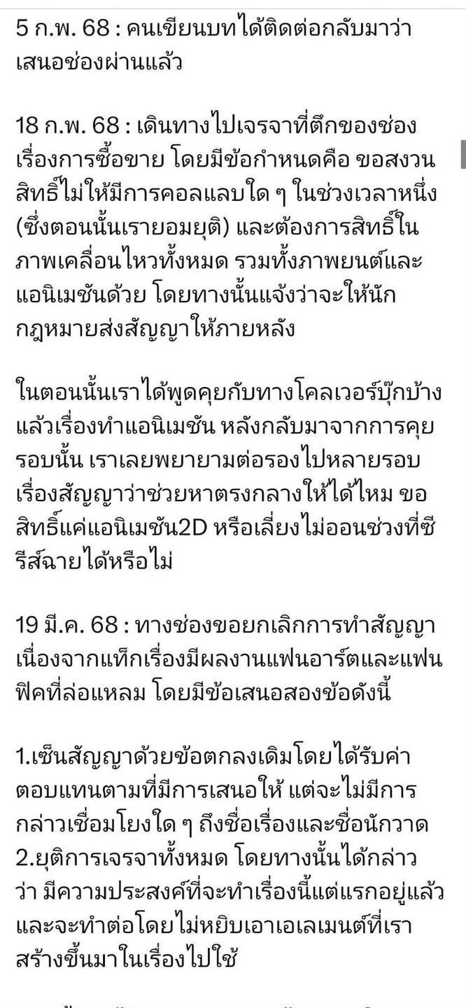 โดยระบุว่า จุดเริ่มต้นเกิดขึ้นตั้งแต่วันที่ 22 มกราคม 2568 เมื่อมีผู้ติดต่อเข้ามาทางข้อความส่วนตัว แสดงความสนใจนำผลงานไปพัฒนาเป็นซีรีส์ พร้อมมีการพูดคุยทางโทรศัพท์เกี่ยวกับแนวทางการดัดแปลงเนื้อหา