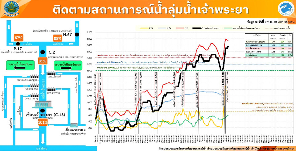 วันที่ 9 พ.ย.68 ศูนย์ปฏิบัติการน้ำอัจฉริยะ (SWOC) กรมชลประทาน เปิดเผยว่า ฝนที่ตกหนักต่อเนื่องจากอิทธิพลของพายุ “คัลแมกี” ในพื้นที่ตอนบน ส่งผลให้ปริมาณน้ำในแม่น้ำสายหลักเพิ่มสูงขึ้นต่อเนื่อง โดยที่สถานีวัดน้ำ P.17 แม่น้ำปิง มีปริมาณไหลผ่านในอัตรา 1,186 ลบ.ม./วินาที สถานีวัดน้ำ Y.64 แม่น้ำยม มีปริมาณไหลผ่านในอัตรา 496 ลบ.ม./วินาที และสถานีวัดน้ำ N.67 แม่น้ำน่าน มีปริมาณไหลผ่านในอัตรา 1,225 ลบ.ม./วินาที ก่อนที่จะไหลมารวมกันที่จังหวัดนครสวรรค์ ลงสู่แม่น้ำเจ้าพระยา ทำให้ที่สถานี C.2 อ.เมือง จ.นครสวรรค์ มีปริมาณไหลผ่านในอัตรา 2,948 ลบ.ม./วินาที