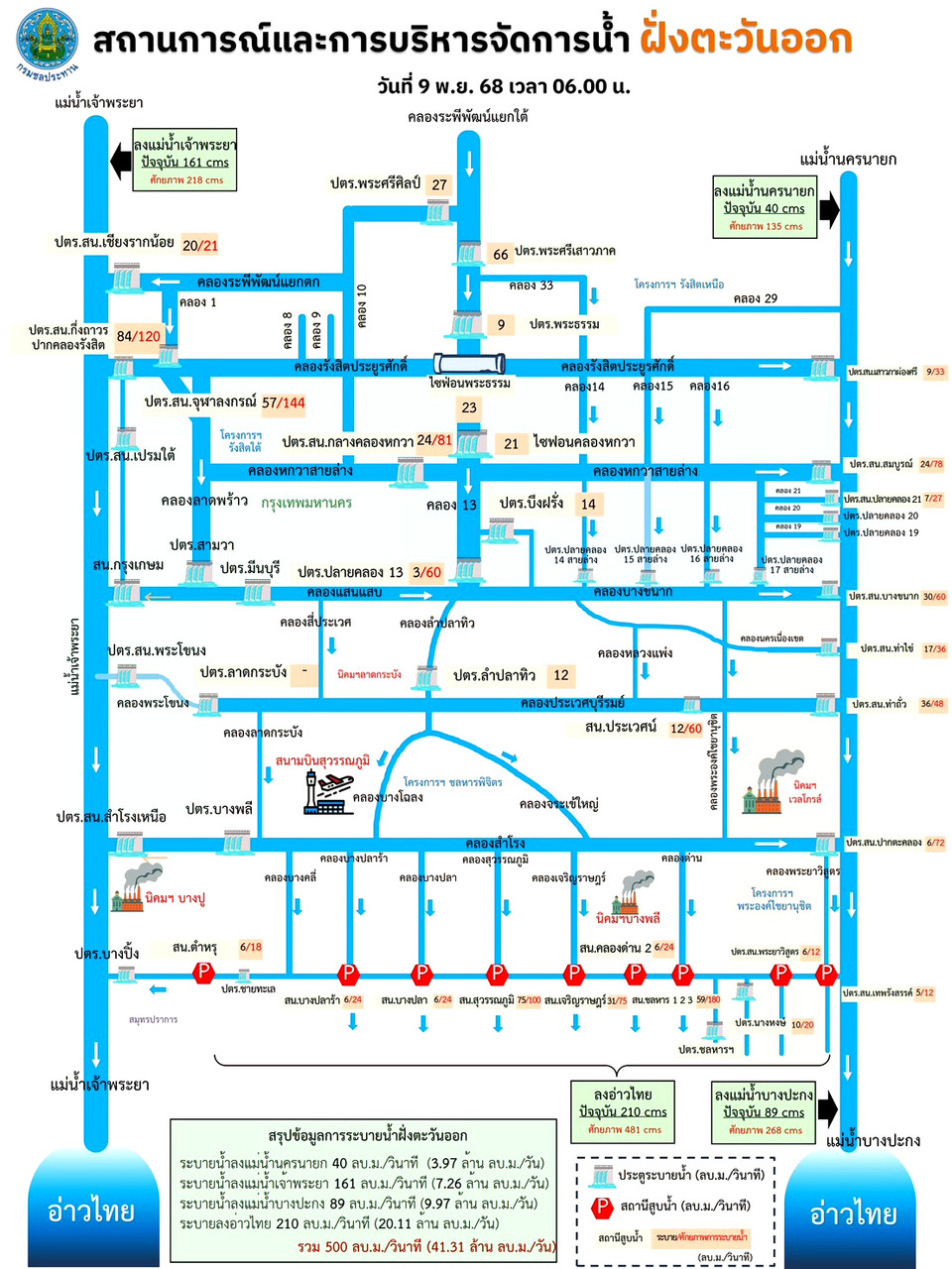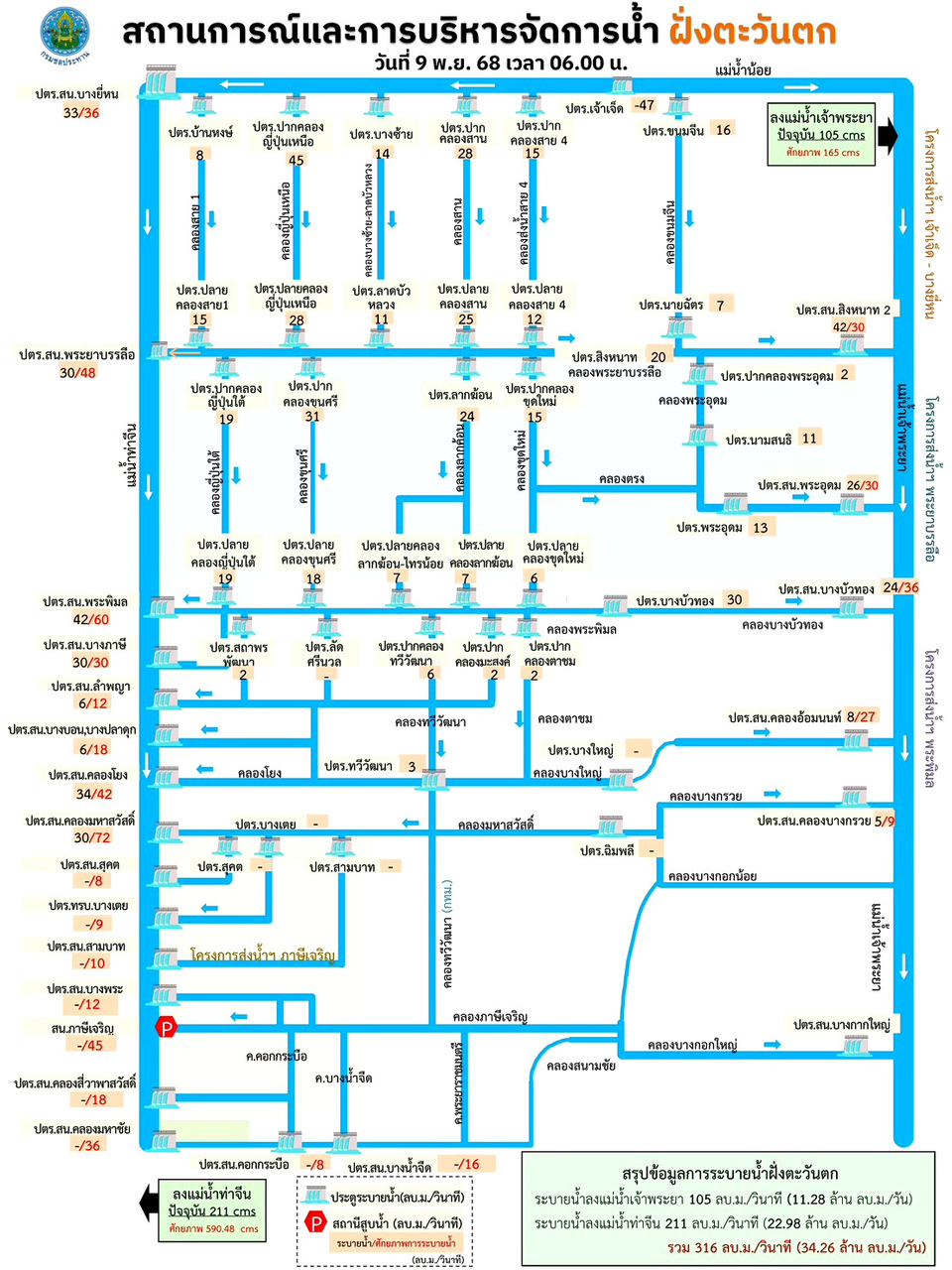 กรมชลประทาน ได้บริหารจัดการน้ำด้านเหนือเขื่อนเจ้าพระยา ด้วยการรับน้ำเข้าระบบชลประทานทั้งสองฝั่งเต็มศักยภาพของลำคลอง พร้อมจะทยอยปรับเพิ่มการระบายน้ำผ่านเขื่อนเจ้าพระยา ตั้งแต่เวลา 10.00น. ของวันนี้ (9 พ.ย.68) จากอัตรา 2,750 ลบ.ม./วินาที เป็น 2,800 ลบ.ม./วินาที ภายในเวลา 15.00 น. และคงอัตราดังกล่าวต่อเนื่อง เพื่อให้สอดคล้องกับสถานการณ์น้ำเหนือและน้ำฝนที่ตกในพื้นที่