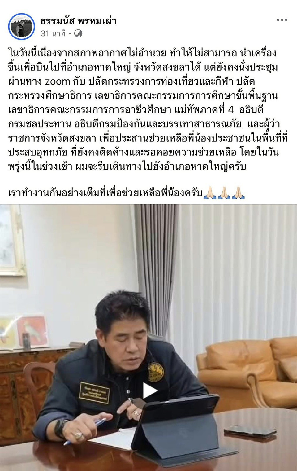 เมื่อเวลา 20.20 น. วันที่ 24 พ.ย.68 ร.อ.ธรรมนัส พรหมเผ่า รองนายกรัฐมนตรี และรัฐมนตรีว่าการกระทรวงเกษตรและสหกรณ์ และผู้อำนวยการศูนย์บริหารจัดการน้ำในสถานการณ์ภัยพิบัติทางธรรมชาติ (ศนภ.) ได้โพสต์เฟซบุ๊กระบุว่า “ในวันนี้เนื่องจากสภาพอากาศไม่เอื้ออำนวย ทำให้ไม่สามารถนำเครื่องขึ้นเพื่อบินไปที่อำเภอหาดใหญ่ จังหวัดสงขลาได้ แต่ยังคงนั่งประชุมผ่านทางระบบ zoom กับปลัดกระทรวงการท่องเที่ยวและกีฬา ปลัดกระทรวงศึกษาธิการ เลขาธิการคณะกรรมการการศึกษาขั้นพื้นฐาน เลขาธิการคณะกรรมการการอาชีวศึกษา แม่ทัพภาคที่ 4 อธิบดีกรมชลประทาน อธิบดีกรมป้องกันและบรรเทาสาธารณภัย และผู้ว่าราชการจังหวัดสงขลา เพื่อประสานช่วยเหลือพี่น้องประชาชนในพื้นที่ที่ประสบอุทกภัย ที่ยังคงติดค้างและรอคอยความช่วยเหลือ