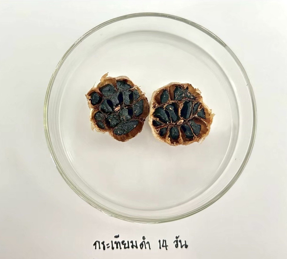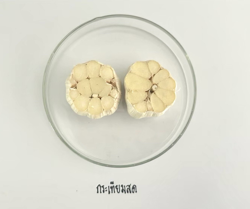ผู้ช่วยศาสตราจารย์ ดร.จิรนันต์ รัตสีวอ หัวหน้าโครงการวิจัยฯ กล่าวเพิ่มเติมว่า ตลอดระยะเวลา 1 ปีคณะวิจัยได้จัดทำแปลงสาธิตต้นแบบจำนวน 13 แปลง และถ่ายทอดองค์ความรู้ให้เกษตรกรกว่า 50 ราย ครอบคลุมตั้งแต่กระบวนการผลิตกระเทียมตามมาตรฐาน GAP และ GI ไปจนถึงการแปรรูปเป็น “กระเทียมดำ” ด้วยเครื่องบ่มอุณหภูมิ 60–90 °C และความชื้นสัมพัทธ์ร้อยละ 80-85 ภายใต้หลักการเกิด ปฏิกิริยาเมลลาร์ด (Maillard Reaction) ที่ทำให้กลีบกระเทียมเปลี่ยนเป็นสีดำ รสหวานนุ่ม ไม่มีกลิ่นฉุน และเก็บได้นานกว่า 12 เดือน พร้อมยังอุดมไปด้วยสารสำคัญทางชีวภาพ เช่น S-allylcysteine (SAC) สารฟีนอลิกและสารฟลาโวนอยด์ ซึ่งเป็นสารต้านอนุมูลอิสระประสิทธิภาพสูง โดยงานวิจัยพบว่า “กระเทียมดำศรีสะเกษ” มีปริมาณ SAC 0.485 มก./กรัม (แบบโทน) และ 0.399 มก./กรัม (แบบกลีบ) อยู่ในเกณฑ์มาตรฐานของ สำนักงานคณะกรรมการอาหารและยา (อย.) ซึ่งเป็นดัชนีสำคัญของอาหารสุขภาพระดับพรีเมียม