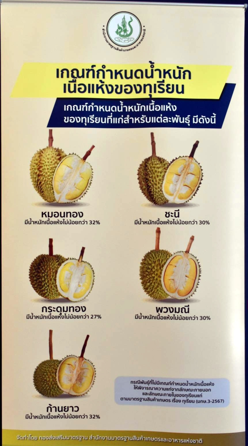 นายสัตวแพทย์ชัยวัฒน์ โยธคล เลขาธิการสำนักงานมาตรฐานสินค้าเกษตรและอาหารแห่งชาติ เปิดเผยว่า มาตรฐานบังคับ เรื่อง หลักปฏิบัติในการตรวจและรับผลทุเรียนสำหรับโรงรวบรวมและโรงคัดบรรจุ (มกษ. 9070-2566) มีผลบังคับใช้ตั้งแต่วันที่ 10 กรกฎาคม 2568 ผู้ผลิต และผู้ส่งออกต้องขอรับใบอนุญาต และการรับรองมาตรฐานดังกล่าวให้ถูกต้อง รวมถึงต้องแจ้งการส่งออกทุกครั้ง ตามพระราชบัญญัติมาตรฐานสินค้าเกษตร พ.ศ. 2551 ด้วย ทั้งนี้ จากข้อมูลปี 2568 มีจำนวนโรงรวบรวมและโรงคัดบรรจุทุเรียนสดที่ขึ้นทะเบียนกับกรมวิชาการเกษตร 1,709 ราย โดยอยู่ในพื้นที่ภาคตะวันออก (จันทบุรี ระยอง ตราด) 883 ราย ภาคใต้ 639 ราย และภาคอื่นๆ 187 ราย ซึ่งในภาคตะวันออก พบว่ามีการขอใบอนุญาตเป็นผู้ผลิตตามมาตรฐานบังคับกับ มกอช. แล้ว 491 ราย ทั้งนี้ ยังเหลือโรงรวบรวมและโรงคัดบรรจุที่ยังไม่ขอรับใบอนุญาตอีก 392 ราย