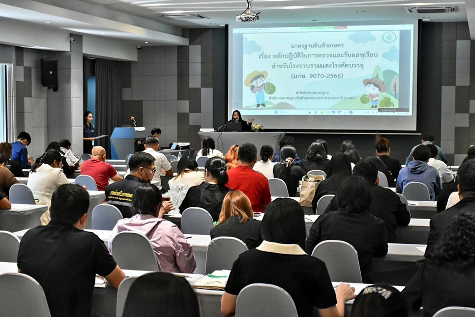 สำนักงานมาตรฐานสินค้าเกษตรและอาหารแห่งชาติ (มกอช.) โดยกองควบคุมมาตรฐาน ในฐานะที่รับผิดชอบกำกับดูแลสินค้าเกษตรให้เป็นตามมาตรฐานบังคับได้จัดสัมมนาเพิ่มประสิทธิภาพการปฏิบัติตามมาตรฐานบังคับ เรื่อง หลักปฏิบัติในการตรวจและรับผลทุเรียนสำหรับโรงรวบรวมและโรงคัดบรรจุ (มกษ.9070-2566) เมื่อวันที่ 16 ธันวาคม 2568 ณ โรงแรมบลูแรบบิท จังหวัดจันทบุรี โดยวัตถุประสงค์เพื่อสร้างความตระหนักให้แก่ผู้ประกอบการโรงรวบรวมและโรงคัดบรรจุทุเรียนในการปฏิบัติตามข้อกำหนดของมาตรฐานบังคับ เรื่อง หลักปฏิบัติในการตรวจและรับผลทุเรียนสำหรับโรงรวบรวมและโรงคัดบรรจุ (มกษ. 9070-2566) เพื่อควบคุมความอ่อน-แก่ของทุเรียน ภายในงานยังมีการให้ความรู้ด้านกฎระเบียบ