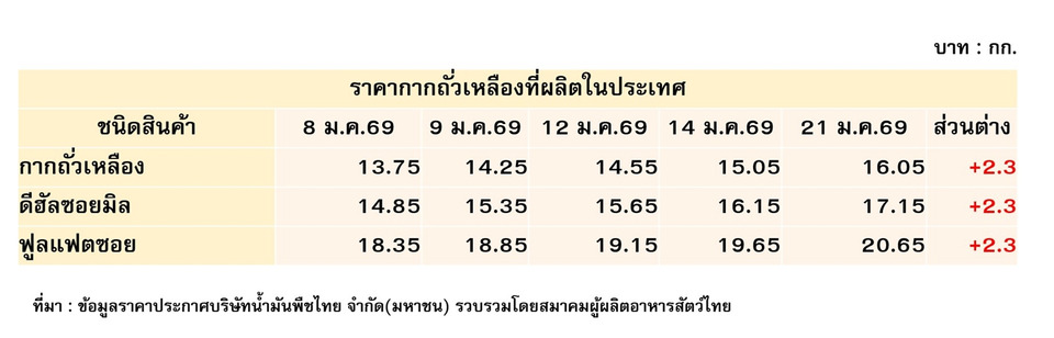 ปัจจุบันราคาวัตถุดิบกากถั่วเหลืองภายในประเทศมีการปรับขึ้นแล้ว 20% หรือ 2.30 บาท/กิโลกรัม โดยเริ่มจากราคาขายวันที่ 8 มกราคมอยู่ที่ 14.85 บาท/กิโลกรัม มีการปรับขึ้น 2 ครั้ง ในวันที่ 9 และ 12 มกราคม 2568 ในราคา 0.50 บาท และ 0.30 บาท/กิโลกรัม ตามลำดับ สมาคมจึงได้มีหนังสือ 2 ฉบับไปยังสมาคมผู้ผลิตน้ำมันถั่วเหลืองและรำข้าวขอให้ปรับราคาลงและอย่าฉวยโอกาสในช่วงวิกฤตนี้ขึ้นราคา รวมถึงมีหนังสือไปยังอธิบดีกรมการค้าภายในให้ตรวจสอบการขึ้นราคาดังกล่าว เพราะราคาที่ปรับขึ้นนั้นสวนทางราคากากถั่วเหลืองตลาดโลกที่ยังทรงตัว หลังจากนั้นก็ยังมีการปรับราคาขึ้นอีก 0.50 บาท/กิโลกรัม ในวันที่ 14 มกราคม 2569 แสดงให้เห็นว่าหนังสือที่สมาคมทำไปไม่ได้ถูกพิจารณา และมาขึ้นราคาอีกครั้งหนึ่งในนี้ อีก 1 บาท/กิโลกรัม ทำให้ราคาตอนนี้อยู่ที่ 17.15 บาท/กิโลกรัม ซึ่งการขึ้นราคาครั้งนี้เป็นการขึ้นภายหลังจากทราบว่า การประชุมคณะรัฐมนตรีในวันที่ 20 มกราคม 2569 ไม่มีการพิจารณาเรื่องนี้ การกระทำเช่นนี้ถือเป็นการซ้ำเติมภาคปศุสัตว์ที่ต้องแบกรับค่าใช้จ่ายจากการรอคอยตรวจปล่อยสินค้าอยู่แล้ว ต้องมาซื้อกากถั่วเหลืองในประเทศที่สูงขึ้นด้วย รัฐบาลจึงต้องรีบเข้ามาดำเนินการแก้ไขปัญหานี้อย่างเร่งด่วน โดยใช้กลไกคณะกรรมการกลางว่าด้วยสินค้าและบริการเข้ามาดูแล เช่นเดียวกับที่อาหารสัตว์ถูกควบคุมราคา มิฉะนั้นโรงงานอาหารสัตว์อาจจะต้องปิดโรงงานเพราะแบกรับต้นทุนไม่ไหวปรับราคาขายก็ปรับไม่ได้