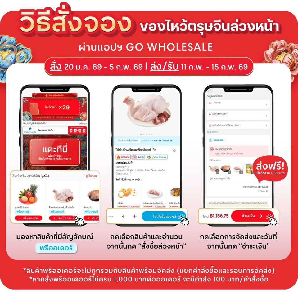 ที่สำคัญ โก โฮลเซลล์ เปิดบริการพรีออเดอร์ รับสั่งของล่วงหน้า เพิ่มความสะดวกและเตรียมความพร้อมก่อนวันไหว้ ผ่านแอปฯ GO WHOLESALE รับคะแนน The1 X10 เริ่มสั่งซื้อตั้งแต่วันนี้ถึง 5 กุมภาพันธ์ 2569 พร้อมรับสินค้าในวันที่ 11-15 กุมภาพันธ์ 2569 ซึ่งมีวัตถุดิบที่ใช้ในเทศกาลตรุษจีนแบบ สด ครบ คุ้ม ทั้งอาหารสด อาหารแห้ง อาหารแช่แข็ง ผัก ผลไม้ และชุดเครื่องไหว้ต่างๆ