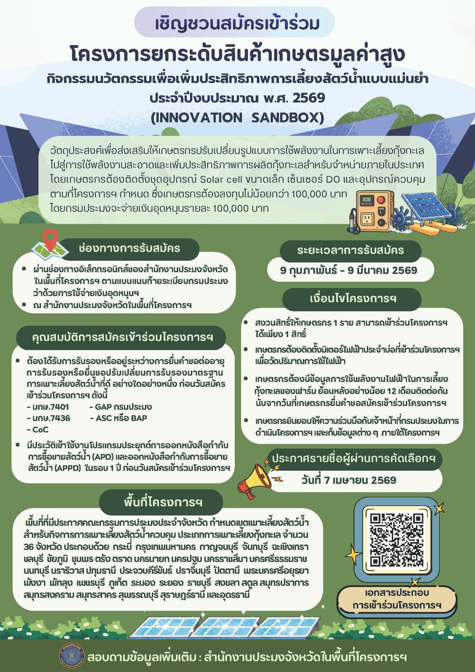 กรมประมงเปิดรับสมัครเกษตรกรผู้เลี้ยงกุ้งทะเลเข้าร่วมโครงการยกระดับสินค้าเกษตรมูลค่าสูง ภายใต้กิจกรรมนวัตกรรมเพื่อเพิ่มประสิทธิภาพการเลี้ยงสัตว์น้ำแบบแม่นยำ ประจำปีงบประมาณ พ.ศ. 2569 (INNOVATION SANDBOX) โดยมุ่งส่งเสริมการประยุกต์ใช้พลังงานสะอาดควบคู่เทคโนโลยีอัจฉริยะ เพื่อยกระดับการบริหารจัดการฟาร์มกุ้งทะเลให้มีความแม่นยำ ได้มาตรฐาน และเป็นมิตรต่อสิ่งแวดล้อม สอดคล้องกับแนวทางการพัฒนาภาคประมงสู่เศรษฐกิจสีเขียว ตลอดจนสนับสนุนนโยบาย “ตลาดนำ นวัตกรรมเสริม เพิ่มรายได้” และขับเคลื่อนอุตสาหกรรมกุ้งไทยสู่ความยั่งยืน ของร้อยเอกธรรมนัส พรหมเผ่า รองนายกรัฐมนตรีและรัฐมนตรีว่าการกระทรวงเกษตรและสหกรณ์