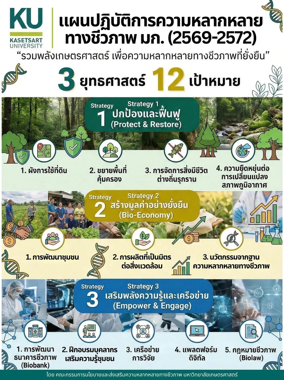 มหาวิทยาลัยเกษตรศาสตร์ในฐานะศูนย์กลางองค์ความรู้ด้านเกษตร ทรัพยากรธรรมชาติ และวิทยาศาสตร์ชีวภาพของประเทศ ได้พัฒนาแผนปฏิบัติการที่ครอบคลุมทั้งมิติการอนุรักษ์ การสร้างมูลค่าทางเศรษฐกิจ และการพัฒนาศักยภาพของสังคม ผ่าน 3 ยุทธศาสตร์หลัก และ 12 เป้าหมายสำคัญ ได้แก่