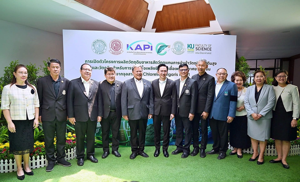 รองนายกฯ และ รมว.อว. ร่วมเปิดตัว “Chlorella vulgaris KU-01” นวัตกรรมวิจัยชั้นนำของมหาวิทยาลัยเกษตรศาสตร์ร่วมกับภาคเอกชน ขับเคลื่อนความมั่นคงอาหาร พลังงาน และเศรษฐกิจชีวภาพของประเทศ ความสำเร็จของนักวิจัยไทยในการพัฒนาจุลสาหร่ายสายพันธุ์จดทะเบียน “Chlorella vulgaris KU-01” สู่การเป็นวัตถุดิบโปรตีนสูงสำหรับอาหารสัตว์ทดแทนการนำเข้า และต่อยอดสู่พลังงานชีวภาพ–เชื้อเพลิงอากาศยานยั่งยืน (Sustainable Aviation Fuel: SAF) พร้อมใช้ประโยชน์จริงในทุกภาคส่วนเพื่อรับมือวิกฤตโลก
