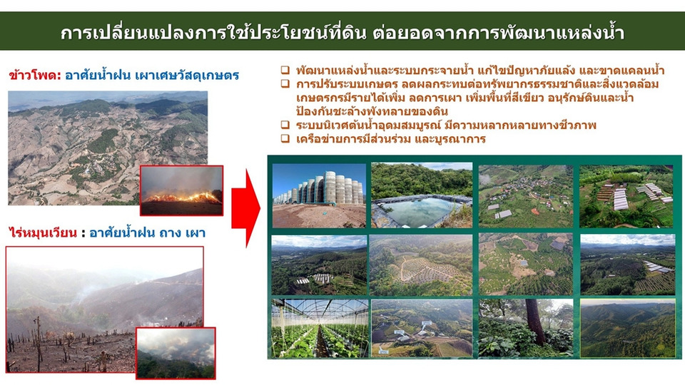 จากนั้น สวพส.จึงต่อยอดในการส่งเสริมให้เกษตรกรปรับสู่ “ระบบการเกษตรแบบประณีตที่เป็นมิตรต่อสิ่งแวดล้อม” เน้นใช้พื้นที่น้อย ใช้น้ำน้อย แต่สร้างมูลค่าสูง โดยแนะนำการปลูกพืชทางเลือกที่มีตลาดรองรับ เช่น ผักในโรงเรือน กาแฟ อะโวคาโด เสาวรสหวาน และโกโก้ พร้อมสนับสนุนระบบให้น้ำที่มีประสิทธิภาพ เช่น ระบบน้ำหยด เพื่อให้ใช้น้ำได้อย่างคุ้มค่า ซึ่งแนวทางนี้ช่วยเพิ่มรายได้ให้เกษตรกร ลดการพึ่งพาพืชเชิงเดี่ยว ลดการเผาในพื้นที่เกษตร และลดผลกระทบต่อสิ่งแวดล้อมได้อย่างยั่งยืน