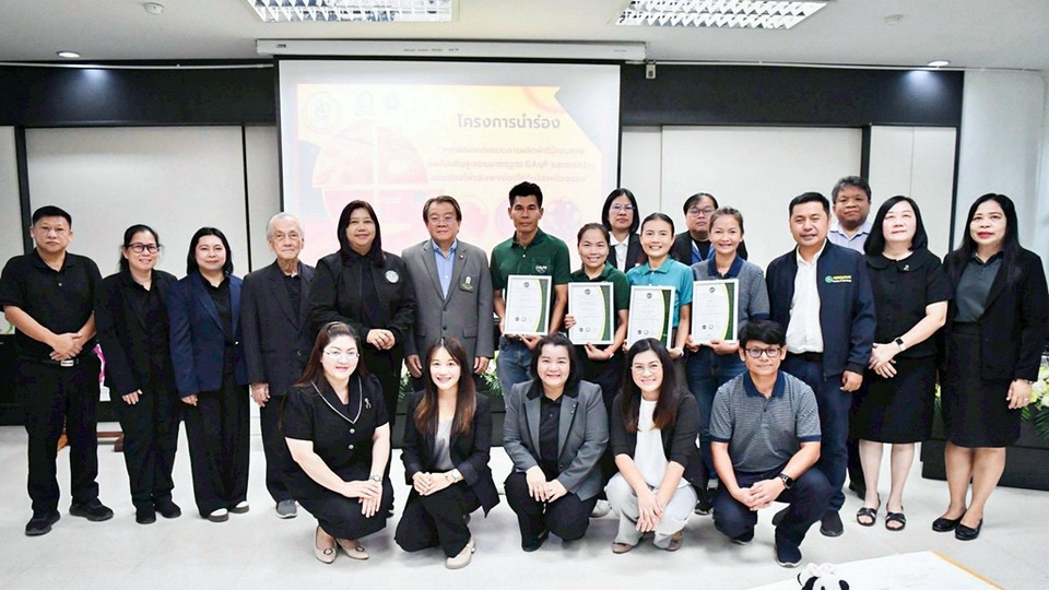 วันที่ 24 เม.ย.69 สำนักงานมาตรฐานสินค้าเกษตรและอาหารแห่งชาติ (มกอช.) ร่วมกับคณะเทคโนโลยี และคณะสาธารณสุขศาสตร์ มหาวิทยาลัยมหาสารคาม (มมส.) จัดพิธีมอบใบรับรองมาตรฐานการปฏิบัติทางการเกษตรที่ดี (GAP) สำหรับพืชอาหาร “ผำ” (มกษ.9001-2564)ให้แก่เกษตรกร จำนวน 4 ราย เมื่อวันที่ 22 เมษายน 2569 ณ คณะเทคโนโลยี มหาวิทยาลัยมหาสารคาม โดยมีนางกาญจนา แดงรุ่งโรจน์ รองเลขาธิการ มกอช. เป็นประธานในพิธี พร้อมด้วยนายปราการ วีรกุล ที่ปรึกษา มกอช. ร่วมมอบใบรับรองมาตรฐาน แก่ นายวุฒิพล ประดับวัน นางสาวอุไรรัตน์ อภิบาลสิงห์ จากกลุ่มวิสาหกิจชุมชนผำสำราญโรจน์ นางสาวอุทัยทิตย์ จำนงนิตย์ จากอะมาวอนฟาร์ม และนางทิพย์สุดา น้อยนาง จากวิสาหกิจชุมชนผู้ผลิตและแปรรูปพืชสวนและพืชน้ำโนนมี้ (ฟาร์มผำพินทิพย์)