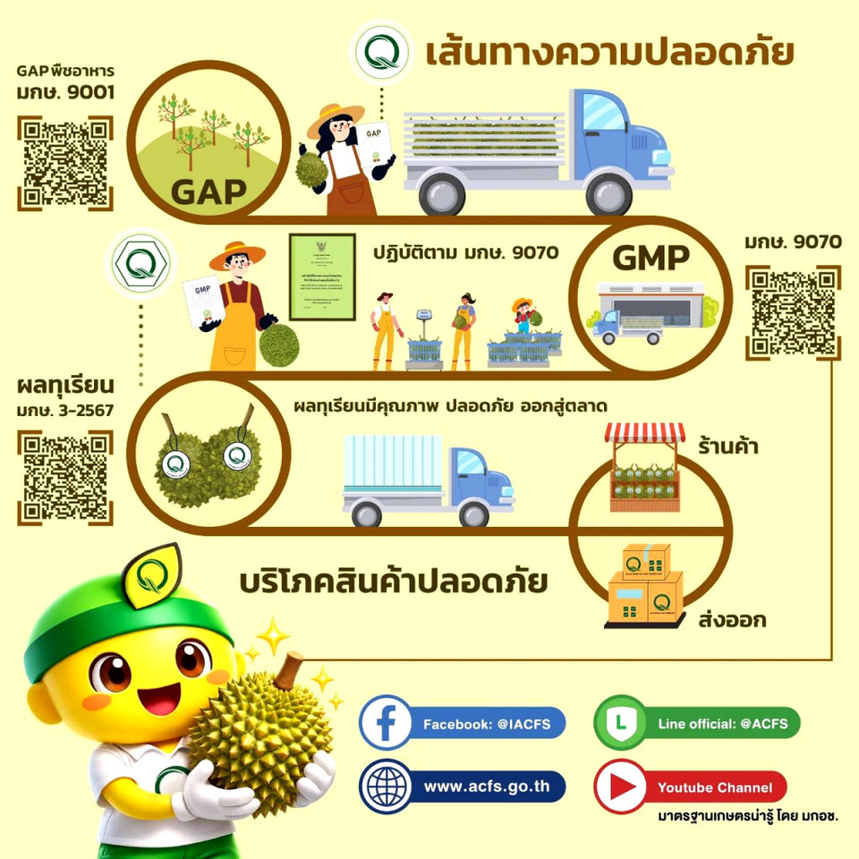 นายชัยวัฒน์ โยธคล เลขาธิการ มกอช. กล่าวเพิ่มเติมว่า ได้รับนโยบายดังกล่าวจากรัฐมนตรีช่วยว่าการกระทรวงเกษตรและสหกรณ์มาขับเคลื่อน โดยจัดชุดเฉพาะกิจปราบปรามสินค้าเกษตรที่ไม่ได้มาตรฐาน นำโดย ผู้อำนวยการกองควบคุมมาตรฐาน ลงพื้นที่ตรวจร่วมกับ ผอ สำนักวิจัยและพัฒนาการเกษตร เขตที่ 6 (สวพ.6) กรมวิชาการเกษตร ระหว่างวันที่ 6–19 เมษายน 2569 ซึ่งเป็นช่วงใกล้การเก็บเกี่ยวทุเรียนพันธุ์หมอนทองและก้านยาว ที่มีผลต่อราคาในตลาดการซื้อ-ขาย และคุณภาพความแก่-อ่อนของทุเรียน