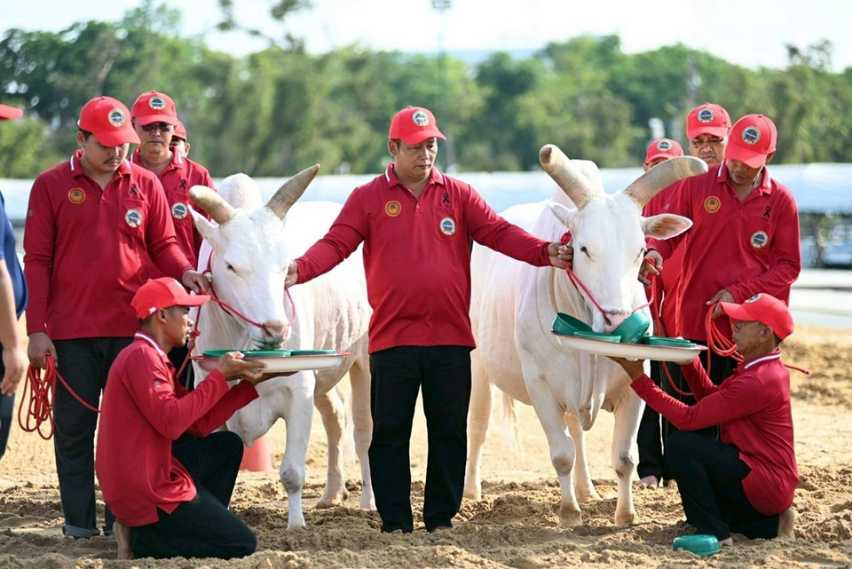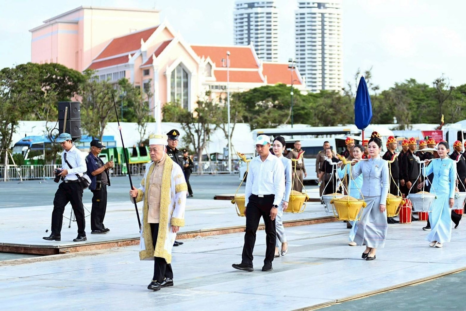 เมื่อเวลา 07.00 น. วันที่ 27 เม.ย.69 นายวิณะโรจน์ทรัพย์ส่งสุข ปลัดกระทรวงเกษตรและสหกรณ์ ผู้ทำหน้าที่พระยาแรกนา พร้อมด้วยเทพีคู่หาบทอง ได้แก่ นางสาวฉันทิสา อารีเสวต นายสัตวแพทย์ชำนาญการ สำนักงานมาตรฐานสินค้าเกษตรแ ละอาหารแห่งชาติ และนางสาวอภิชญา ฟูแสง นักวิชาการตรวจสอบบัญชีชำนาญการ กรมตรวจบัญชีสหกรณ์ เทพีคู่หาบเงิน ได้แก่ นางสาวพรจิตรา จันทร์เจริญ นักวิชาการส่งเสริมการเกษตรชำนาญการ กรมส่งเสริมการเกษตร และนางสาวศรัญญา ทองคำ นักวิชาการส่งเสริมการเกษตรปฏิบัติการ กรมส่งเสริมการเกษตร