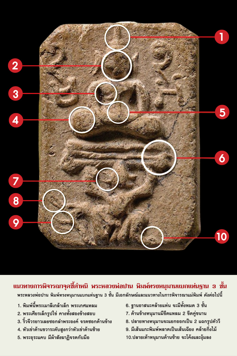 พุทธลักษณะขององค์พระ ด้านบนเป็นพระพุทธรูปประทับนั่ง แสดงปางสมาธิ อยู่เหนือฐานบัลลังก์ก็มี ฐานเขียง ก็มี ฐานผสมก็มี ฐานรูปกลีบบัวมีทั้งชั้นเดียว 2 ชั้น บัวเม็ด และบัวตุ่ม ก็มี ส่วนด้านข้างพระประธานทั้ง 2 ข้าง มีอักขระขอมตัวนูนข้างละ 2 ตัว คือ มะ อะ อุ อุ อันเป็นยอดพระคาถาหัวใจพระไตรปิฎก ‘ตรีเพชร’ ด้านล่าง ใต้ฐานขององค์พระเป็นรูปสัตว์พาหนะ 6 ชนิด คือ ไก่ ครุฑ หนุมาน ปลา เม่น และนก พระหลวงพ่อปาน พิมพ์มาตรฐาน หรือพิมพ์นิยม ซึ่งเป็นที่นิยมเล่นหากันในแวดวงนักนิยมสะสมพระเครื่องนั้น แบ่งแยกเป็นพิมพ์หลัก ๆ ได้ทั้งหมด 6 พิมพ์ ตามชนิดของสัตว์ในนินิดทั้ง ชนิด คือพิมพ์ทรงไก่ พิมพ์ทรงครุฑ พิมพ์ทรงหนุมาน พิมพ์ทรงปลา พิมพ์ทรงเม่น และพิมพ์ทรงนก พิมพ์หลัก ๆ ของพระหลวงพ่อปานทั้ง 6 พิมพ์นี้ ยังแยกย่อยออกเป็นพิมพ์ต่าง ๆ อีกค่อนข้างมากเลยทีเดียวครับ