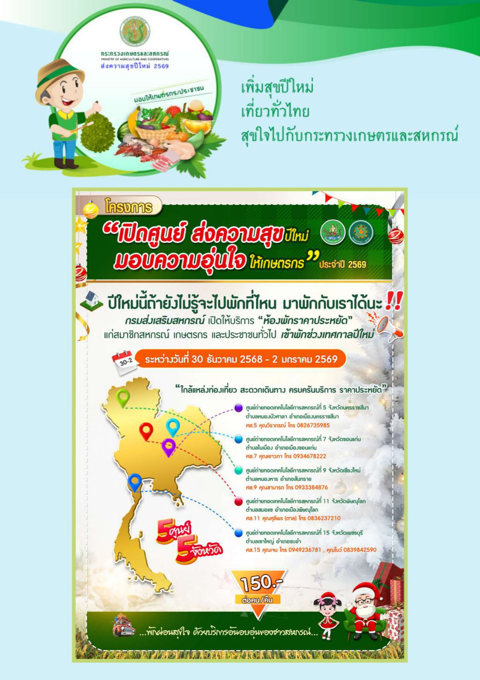 กรมส่งเสริมสหกรณ์เปิดพื้นที่ศูนย์ถ่ายทอดเทคโนโลยีการสหกรณ์เพื่อให้บริการห้องพักราคาประหยัดแก่สมาชิกสหกรณ์ กลุ่มเกษตรกร และประชาชนทั่วไป ในช่วงเทศกาลปีใหม่ จำนวน 5 แห่ง ใน 5 จังหวัดท่องเที่ยว ได้แก่ ศูนย์ถ่ายทอดเทคโนโลยีการสหกรณ์ที่ 5 อำเภอเมืองนครราชสีมา จังหวัดนครราชสีมา ศูนย์ถ่ายทอดเทคโนโลยีการสหกรณ์ที่ 7 อำเภอเมืองขอนแก่น จังหวัดขอนแก่น ศูนย์ถ่ายทอดเทคโนโลยีการสหกรณ์ที่ 9 อำเภอสันทราย จังหวัดเชียงใหม่ ศูนย์ถ่ายทอดเทคโนโลยีการสหกรณ์ที่ 11 อำเภอวังทอง จังหวัดพิษณุโลก และศูนย์ถ่ายทอดเทคโนโลยีการสหกรณ์ที่ 15 อำเภอชะอำ จังหวัดเพชรบุรี ในราคา 150 บาทต่อคนต่อคืน เปิดให้เข้าพักระหว่างวันที่ 30 ธันวาคม 2568 – 2 มกราคม 2569 เพื่อเป็นอีกหนึ่งทางเลือกในการท่องเที่ยวพักผ่อนอย่างประหยัดและอบอุ่นในช่วงเทศกาลแห่งความสุข