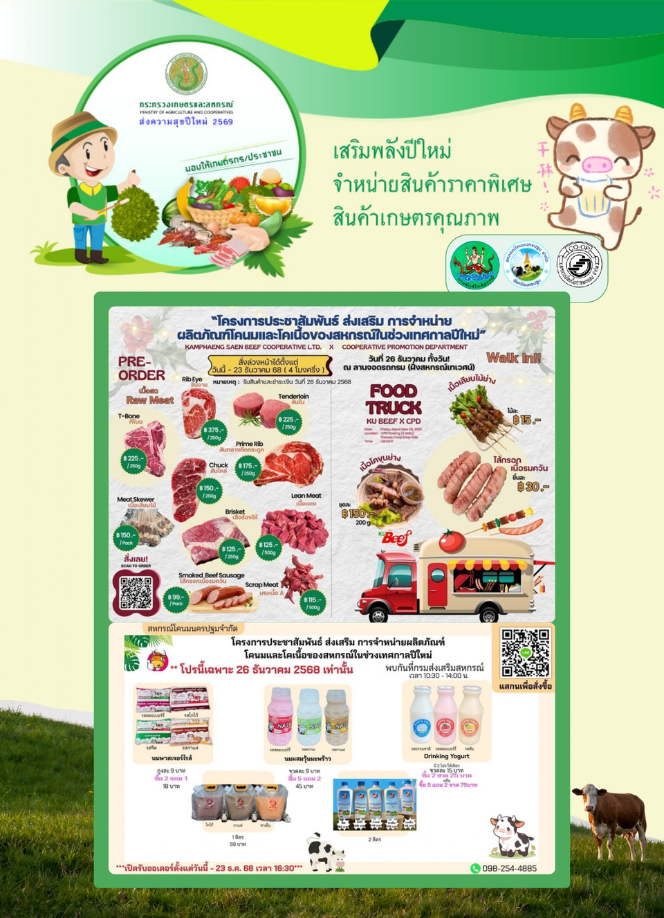 กรมส่งเสริมสหกรณ์ โดยกองพัฒนาสหกรณ์ภาคการเกษตรและกลุ่มเกษตรกรนำผลิตภัณฑ์โคนมและโคเนื้อคุณภาพจากสหกรณ์ อาทิ นมพาสเจอร์ไรส์ นมผสมวุ้นมะพร้าว โยเกิร์ตพร้อมดื่ม จากสหกรณ์โคนมนครปฐม จำกัด และผลิตภัณฑ์โคเนื้อจากสหกรณ์โคเนื้อกำแพงแสน จำกัด โดยมีไฮไลท์ คือ Food Truck KU BEEF X CPD มาจำหน่ายเนื้อโคขุนย่าง เนื้อเสียบไม้ย่าง ไส้กรอกเนื้อรมควัน และเนื้อโคคุณภาพเกรดพรีเมี่ยมในราคาพิเศษ ในวันศุกร์ที่ 26 ธันวาคม 2568 ณ กรมส่งเสริมสหกรณ์ เทเวศร์ กรุงเทพฯ
