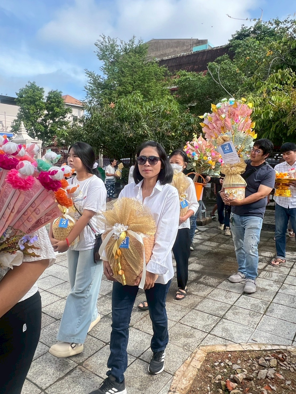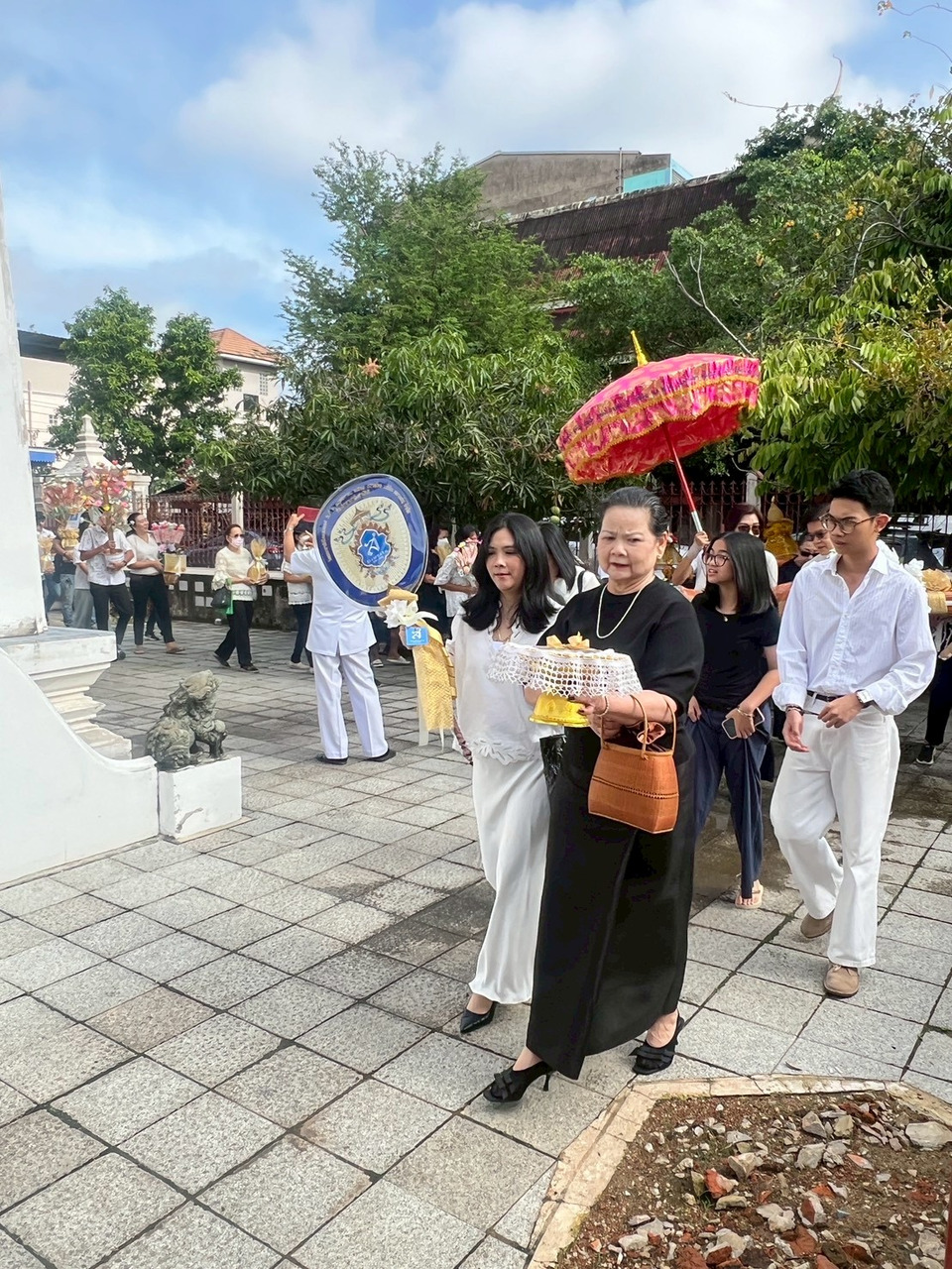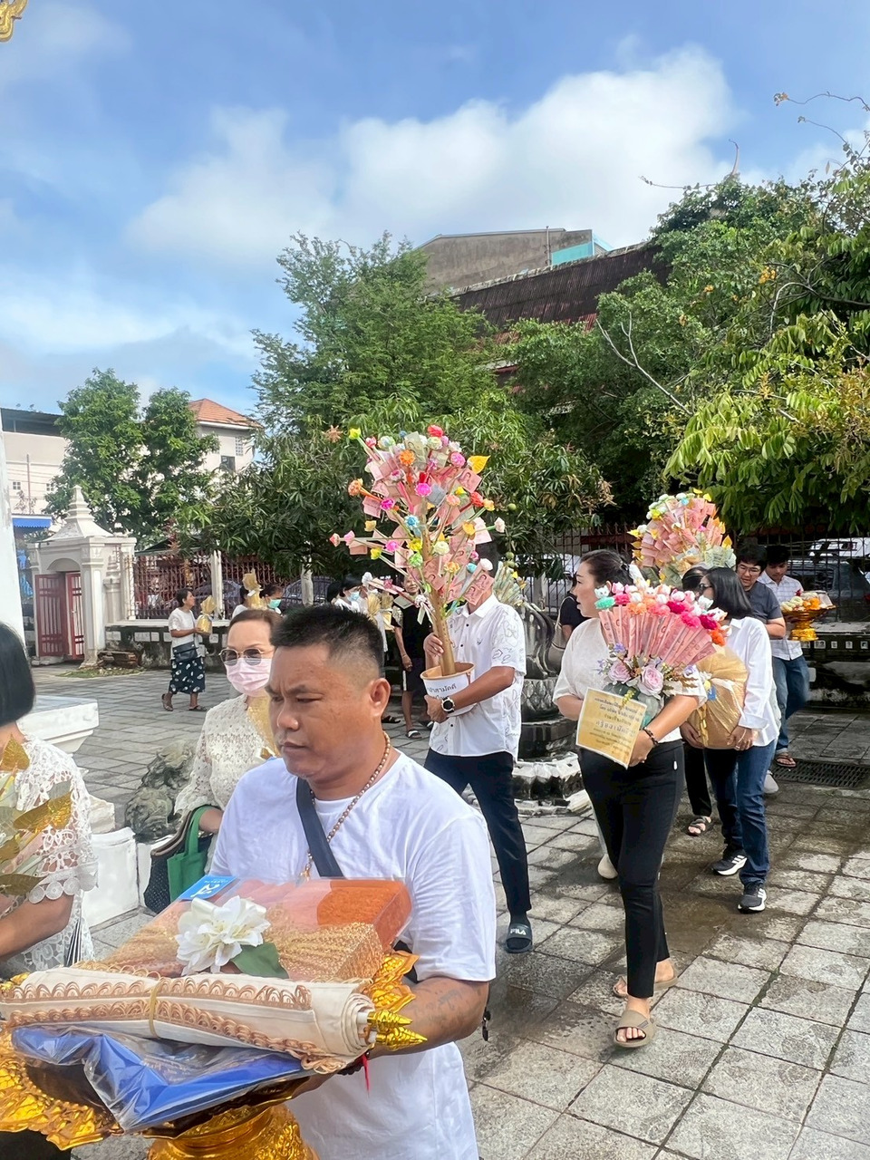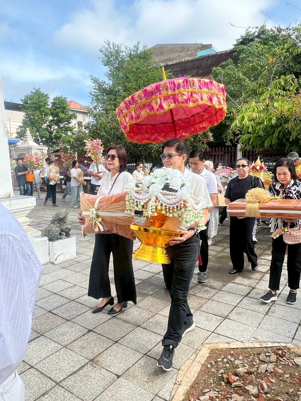 ต่อมาในเวลา 10.00 น. คณะเจ้าภาพและสาธุชนได้ร่วมกันถวายภัตตาหารเพลแด่พระภิกษุสงฆ์ จากนั้นในเวลา 12.00 น. ได้มีการจัดเลี้ยงอาหารแก่แขกผู้มีเกียรติและผู้มาร่วมงาน และออกโรงทาน เพื่อเป็นการขอบคุณในน้ำใจและศรัทธาที่มาร่วมสร้างบุญกุศลครั้งนี้