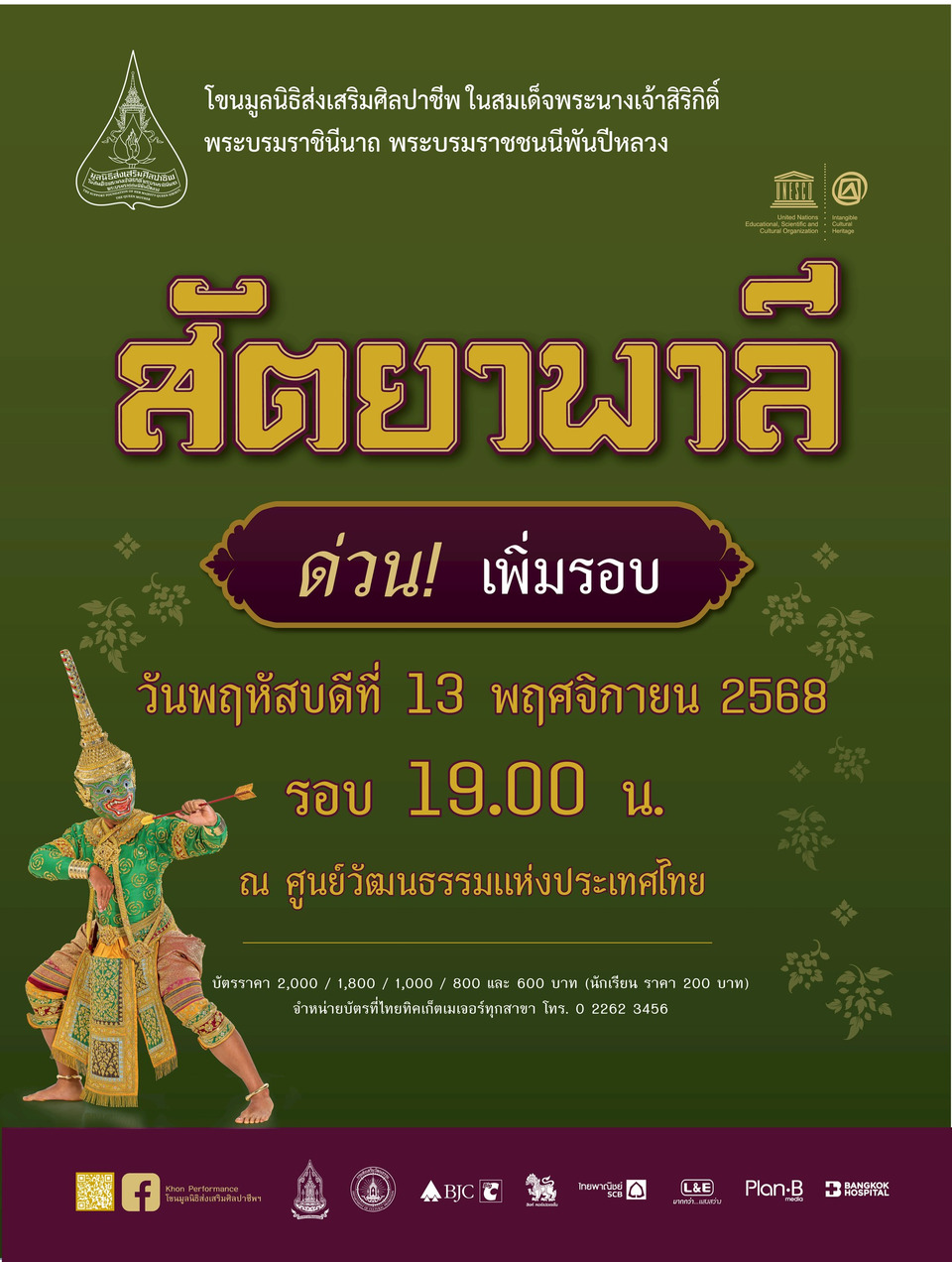 โขนมูลนิธิส่งเสริมศิลปาชีพ ในสมเด็จพระนางเจ้าสิริกิติ์ พระบรมราชินีนาถ พระบรมราชชนนีพันปีหลวง เรื่อง รามเกียรติ์ ตอน "สัตยาพาลี" เพิ่มรอบประชาชน วันพฤหัสบดีที่ 13 พฤศจิกายน 2568 รอบ 19.00 น.