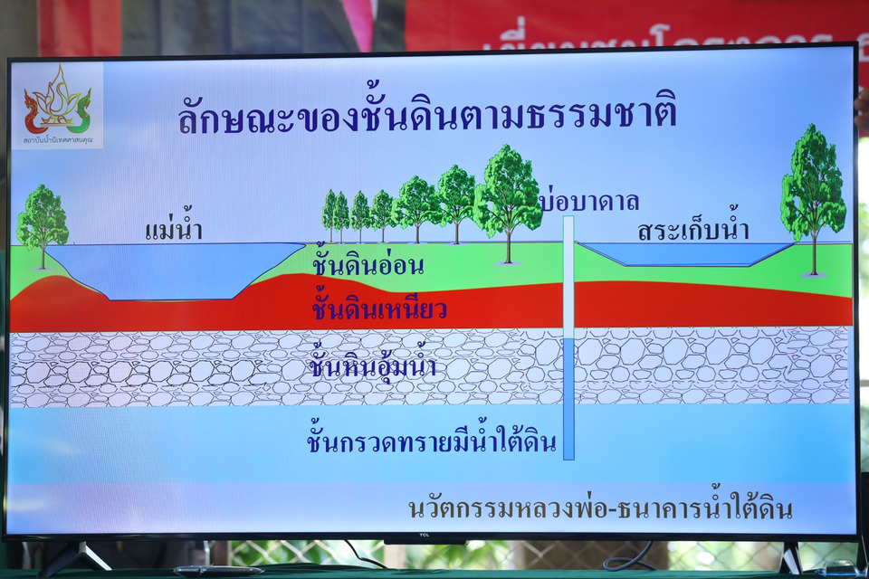 ขณะที่ ดร.เร่งรัด กล่าวว่า ประเทศไทยน้ำท่วม และน้ำแล้งเป็นวัฏจักรทุกปี เพราะมีปริมาณฝนตก 736,802 ล้านลูกบาศก์เมตรต่อปี แต่สามารถเก็บได้เพียง 97,140 ล้านลูกบาศก์เมตรต่อปี คิดเป็น 12% เท่านั้น จึงจะเห็นว่า เราขาดภาชนะเก็บน้ำ ดังนั้น การทำธนาคารน้ำใต้ดินจะช่วยกักเก็บน้ำหน้าฝนให้ได้มากที่สุด และนำน้ำมาใช้ในหน้าแล้งได้ ด้วยหลักการธนาคารน้ำใต้ดิน 2 ระบบ คือ ระบบปิด และระบบเปิด ซึ่งระบบปิดคือ การเติมน้ำลงใต้ดินในชั้นตื้น 3-5 เมตร ด้วยการขุดหลุม เช่น 2x2x2 เมตร โดยเทหินกรวดแม่น้ำลงไป เพื่อดูดซึมน้ำเก็บไว้ ส่วนระบบเปิด คือ การขุดดินให้พ้นชั้นดินเหนียว จนถึงชั้นหินอุ้มน้ำ ซึ่งมีความลึกประมาณ 7-8 เมตร จะทำให้น้ำซึมลงไปเก็บชั้นดาบาลได้ ซึ่งหลักการทำธนาคารน้ำใต้ดิน ต้องทำทั้ง 2 ระบบ จึงจะส่งผลได้อย่างชัดเจน และถ้ามีการไปทำในป่า น้ำจะซับลงดิน จะช่วยป้องกันปัญหาน้ำป่าไหลหลากได้