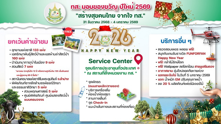 ทส. มอบของขวัญปีใหม่ 2569 “สร้างสุขคนไทย จากใจ ทส.” เปิดแหล่งท่องเที่ยวธรรมชาติฟรีทั่วประเทศ 5 วัน ลดภาระประชาชน กระตุ้นท่องเที่ยวเชิงอนุรักษ์