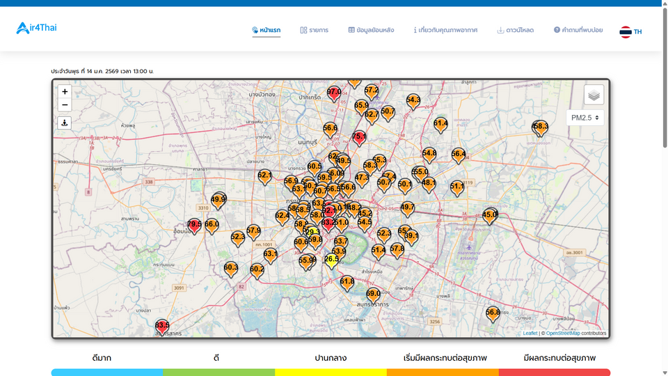 นายสุรินทร์ วรกิจธำรง อธิบดีกรมควบคุมมลพิษ (คพ.) กล่าวว่า ศกพ.ได้รายงานคุณภาพอากาศประจำวันที่ 14 มกราคม 2569 ณ 12:00 น ภาพรวมปริมาณฝุ่นละออง PM2.5 ในประเทศ ขยับสูงขึ้นในหลายพื้นที่ โดยเฉพาะอย่างยิ่ง กทม. ปริมณฑล ภาคกลาง และภาคอีสาน โดยพบเกินค่ามาตรฐาน เป็นสีแดงในพื้นที่ กทม. ได้แก่ เขตบางรัก ปทุมวัน และสาทร รวมถึงจังหวัดนนทบุรีและสมุทรสาคร ในขณะที่พื้นที่อื่นๆ เป็นสีส้ม เริ่มมีผลกระทบต่อสุขภาพ ได้แก่ กทม. 47 เขต รวมถึงหลายจังหวัดของภาคกลาง ภาคอีสาน และบางจังหวัดของภาคเหนือ โดยภาคเหนือ ตรวจวัดได้ 7.5 – 52.6 ไมโครกรัมต่อลูกบาศก์เมตร (มคก./ลบ.ม.) ภาคตะวันออกเฉียงเหนือ 27.3 – 64.9 มคก./ลบ.ม. ภาคกลางและภาคตะวันตก 31.5 - 71.8 มคก./ลบ.ม. ภาคตะวันออก 20.6 - 56.7 มคก./ลบ.ม. ภาคใต้ 16.1 - 44.9 มคก./ลบ.ม. กรุงเทพมหานครและปริมณฑล 39.1 - 98.9 มคก./ลบ.ม.