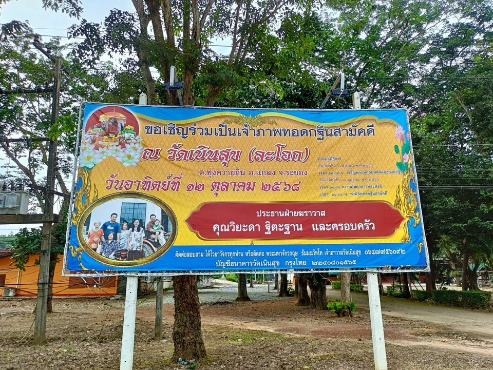 วันที่ 4 ก.ย. 2568 ผู้สื่อข่าวรายงานว่า ที่วัดเนินสุข (วัดละโอก) ถ.เขาดิน–เขาชะเมา ม.9 ต.ทุ่งควายกิน อ.แกลง จ.ระยอง พระมหาจักรกฤษ ธัมมะภัทโท เจ้าอาวาสวัดเนินสุข ได้ประชาสัมพันธ์เชิญชวนชาวพุทธร่วมทำบุญทอดกฐินสามัคคีและร่วมเป็นเจ้าภาพโรงทาน โดยมีป้ายเชิญขนาดใหญ่ติดตั้งบริเวณหน้าวัด แจ้งกำหนดการจัดงานในวันอาทิตย์ที่ 12 ตุลาคม 2568 มีคุณวิยะดา ฐิตะฐาน และครอบครัว เป็นประธานฝ่ายฆราวาสและเจ้าภาพใหญ่ของงาน